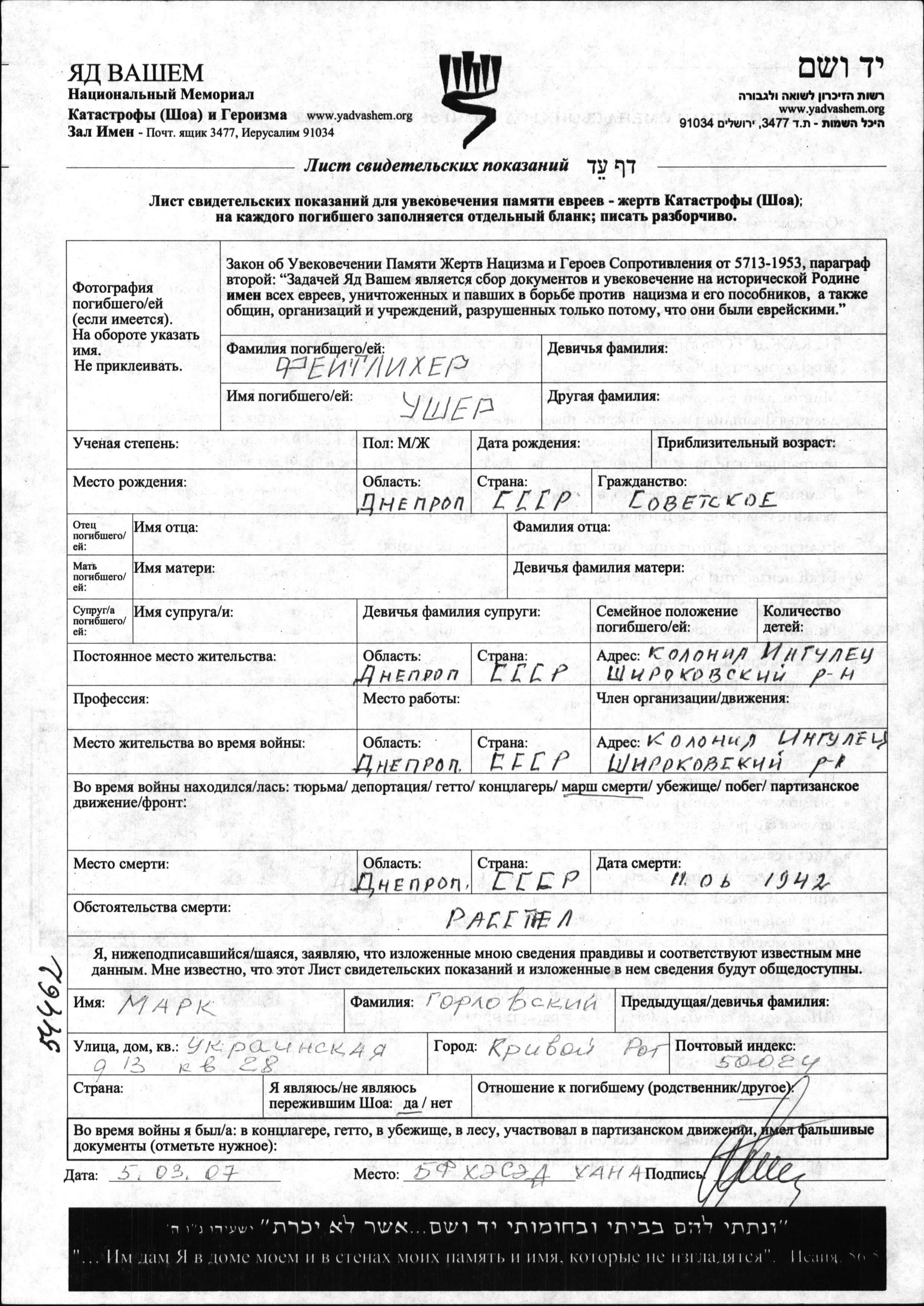 Usher wurde in der Schoah ermordet. Todesort: Dnepropetrovsk, Ukraine (UdSSR) im Jahr 11/06/1942.