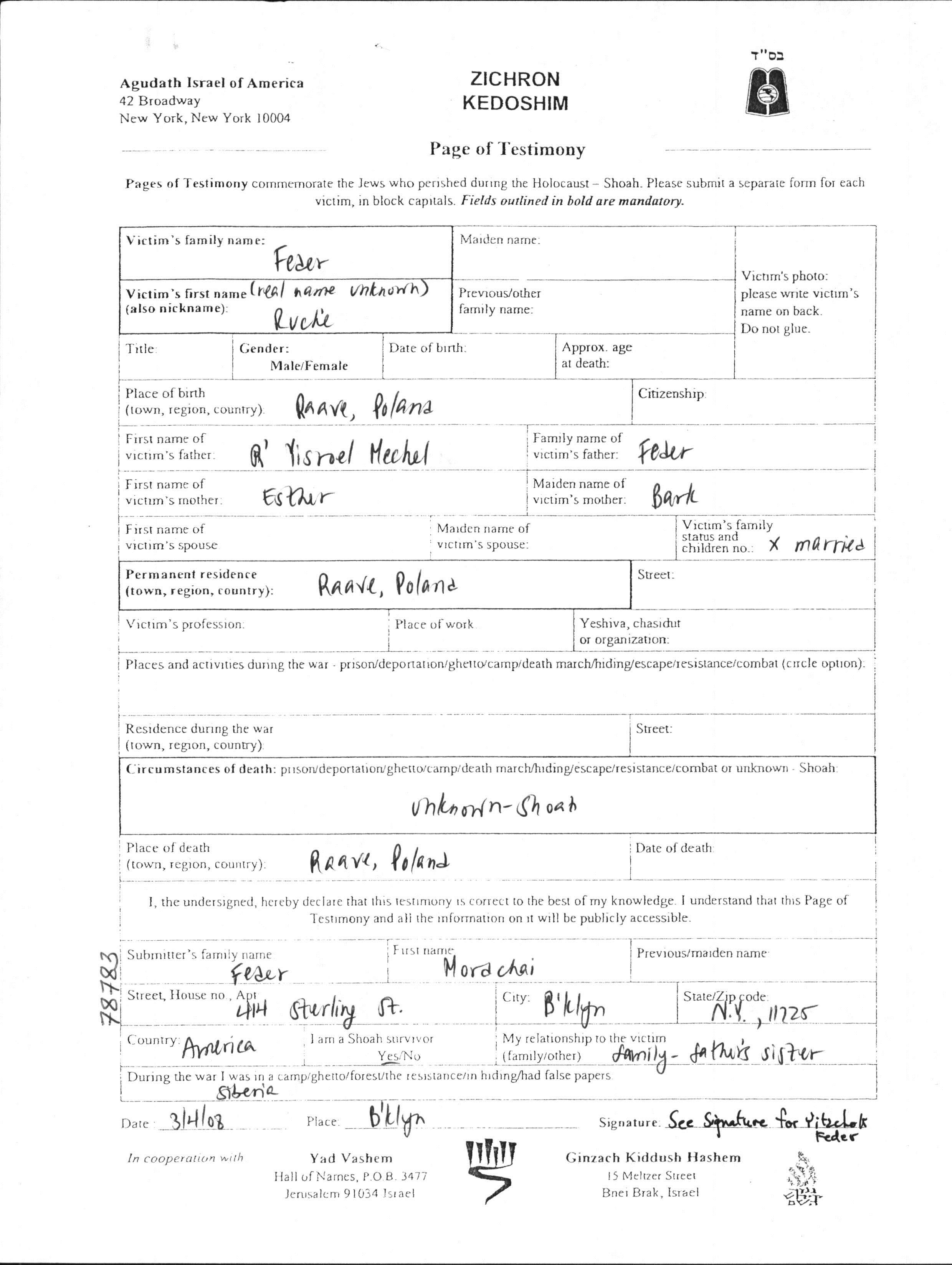 Ruche Feder wurde in Rawa Ruska, Polen geboren. Sie war die Tochter von Yisrael Mechel und Esther, geb. Bark. Sie war Verheiratet. Vor dem Zweiten Weltkrieg lebte sie in Rawa Ruska, Polen. Während des Krieges war sie in Rawa Ruska, Polen.