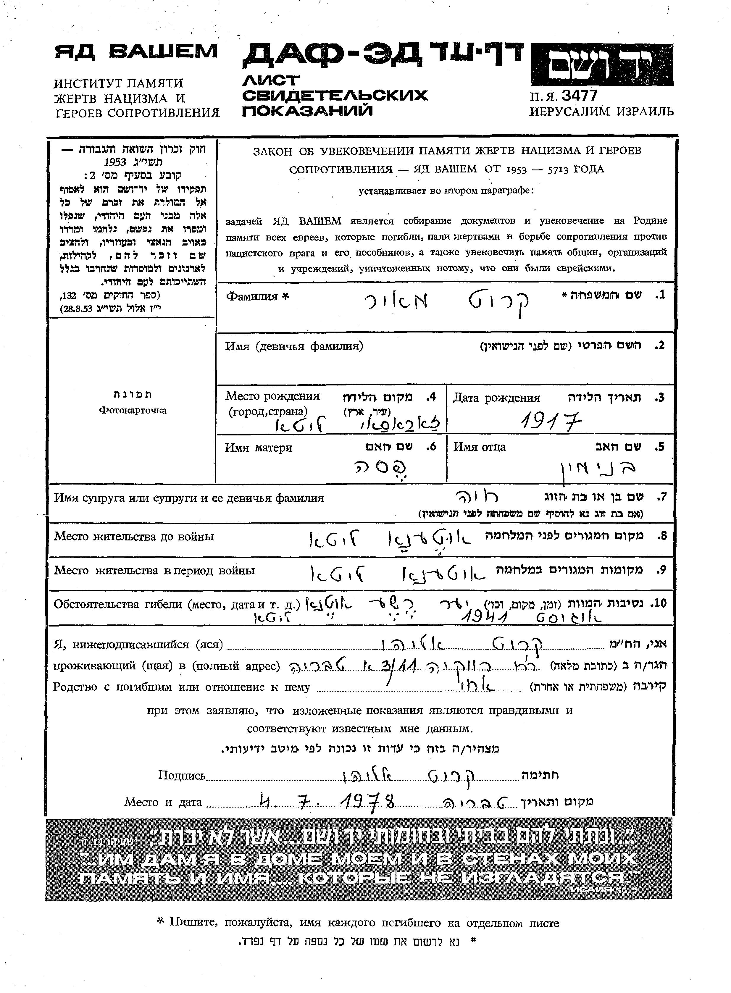 Meir wurde in der Schoah ermordet. Todesort: Utena, Litauen im Jahr 08/1941.