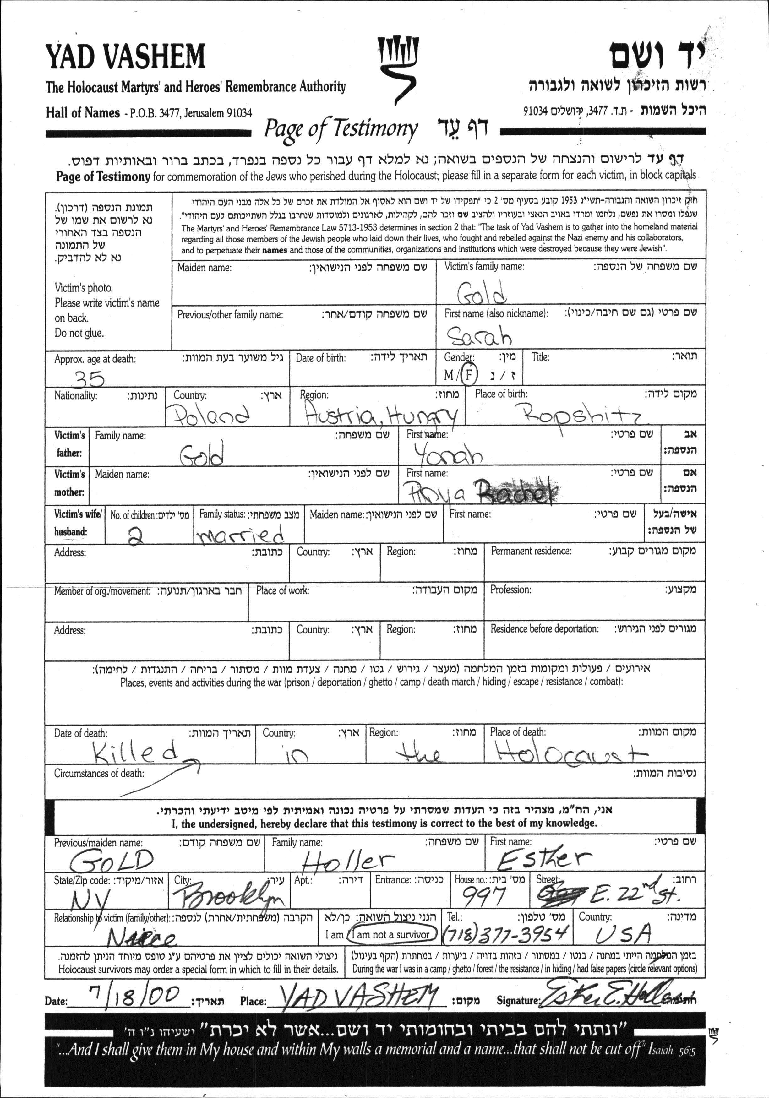 Juden wurden in der Schoah auf verschiedenste Weisen ermordet, unter anderem: Vergasen, Erschiessen, lebendig verbrannt werden, lebendig begraben werden, Tod durch Erschöpfung durch Zwangsarbeit, Epidemien, mangels jeder hygienischer Bedingung oder dem Fehlen medizinischer Versorgung. Manche Juden nahmen sich das Leben, um der Festnahme und weiterer Verfolgung zu entgehen oder ihr hoffnungsloses, nicht nachlassendes Leiden zu beenden.