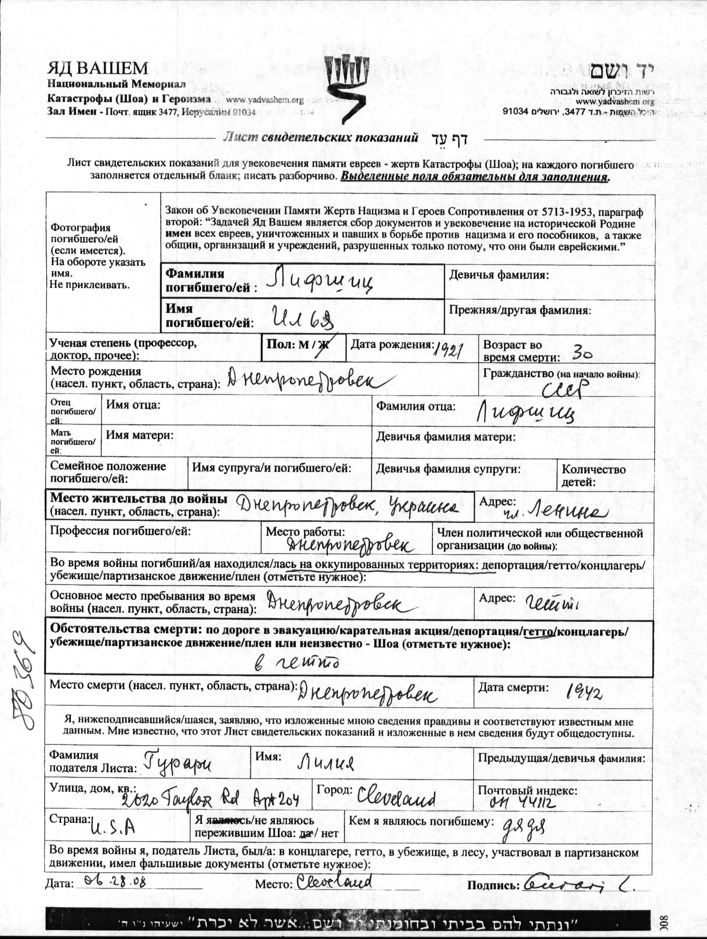 Lifshitz Iliya 1921 Dnepropetrovsk, Ukraine (UdSSR) Gedenkblatt