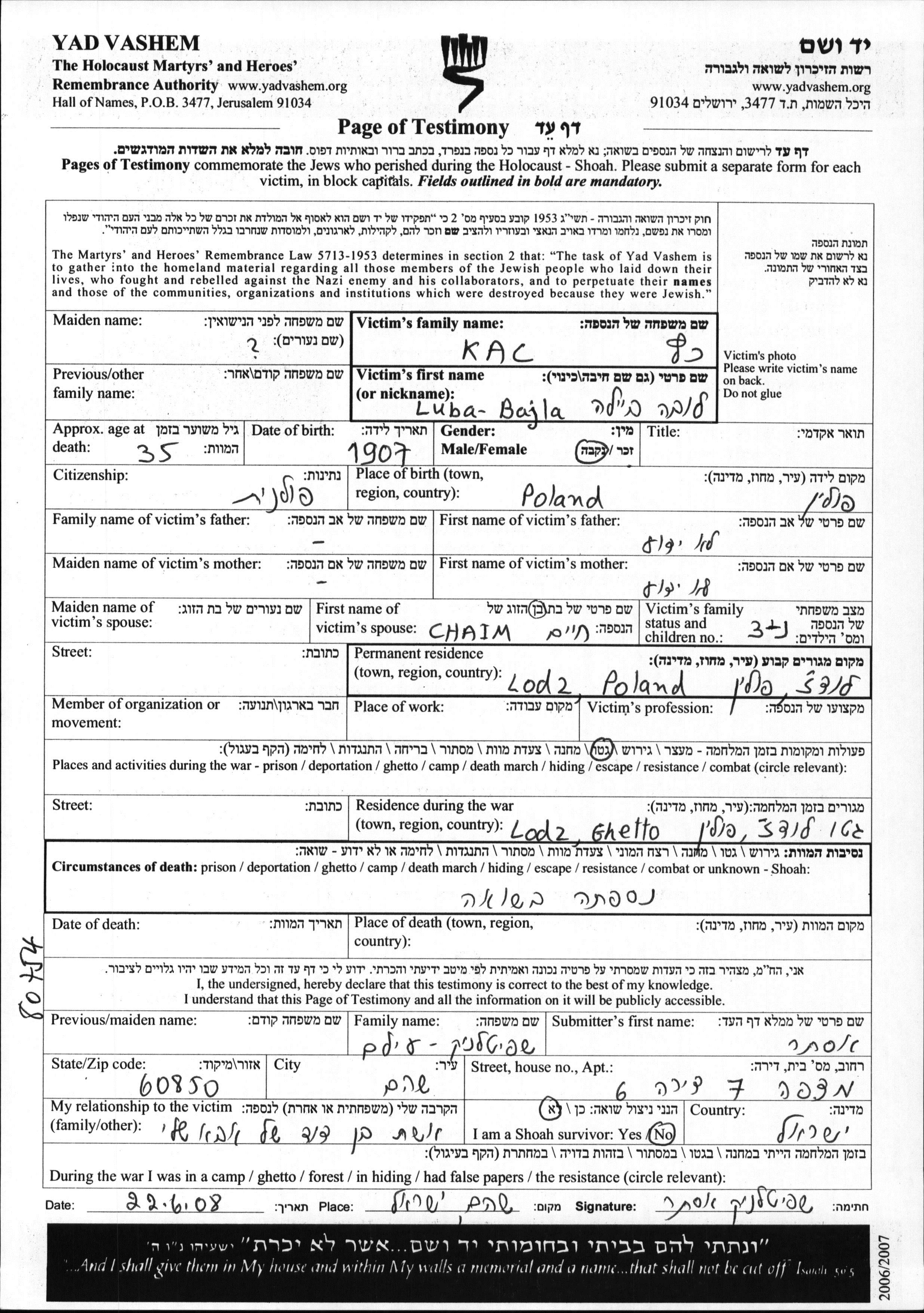 Luba Bajla Kac wurde im Jahr 1907 in Polen geboren. Sie war mit Chaim Verheiratet. Vor dem Zweiten Weltkrieg lebte sie in Lodz, Polen. Während des Krieges war sie in Lodz, Polen.