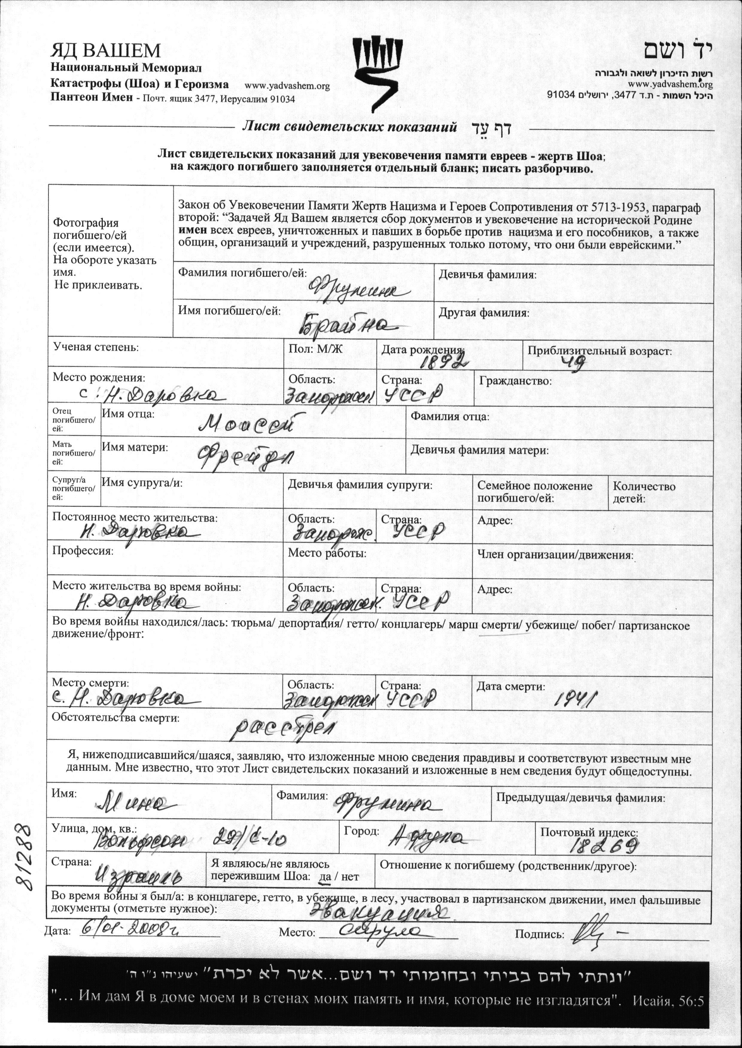 Braina Frumina wurde im Jahr 1892 in Novodarovka, Ukraine (UdSSR) geboren. Sie war die Tochter von Moisei und Freidl. Vor dem Zweiten Weltkrieg lebte sie in Novodarovka, Ukraine (UdSSR). Während des Krieges war sie in Novodarovka, Ukraine (UdSSR).