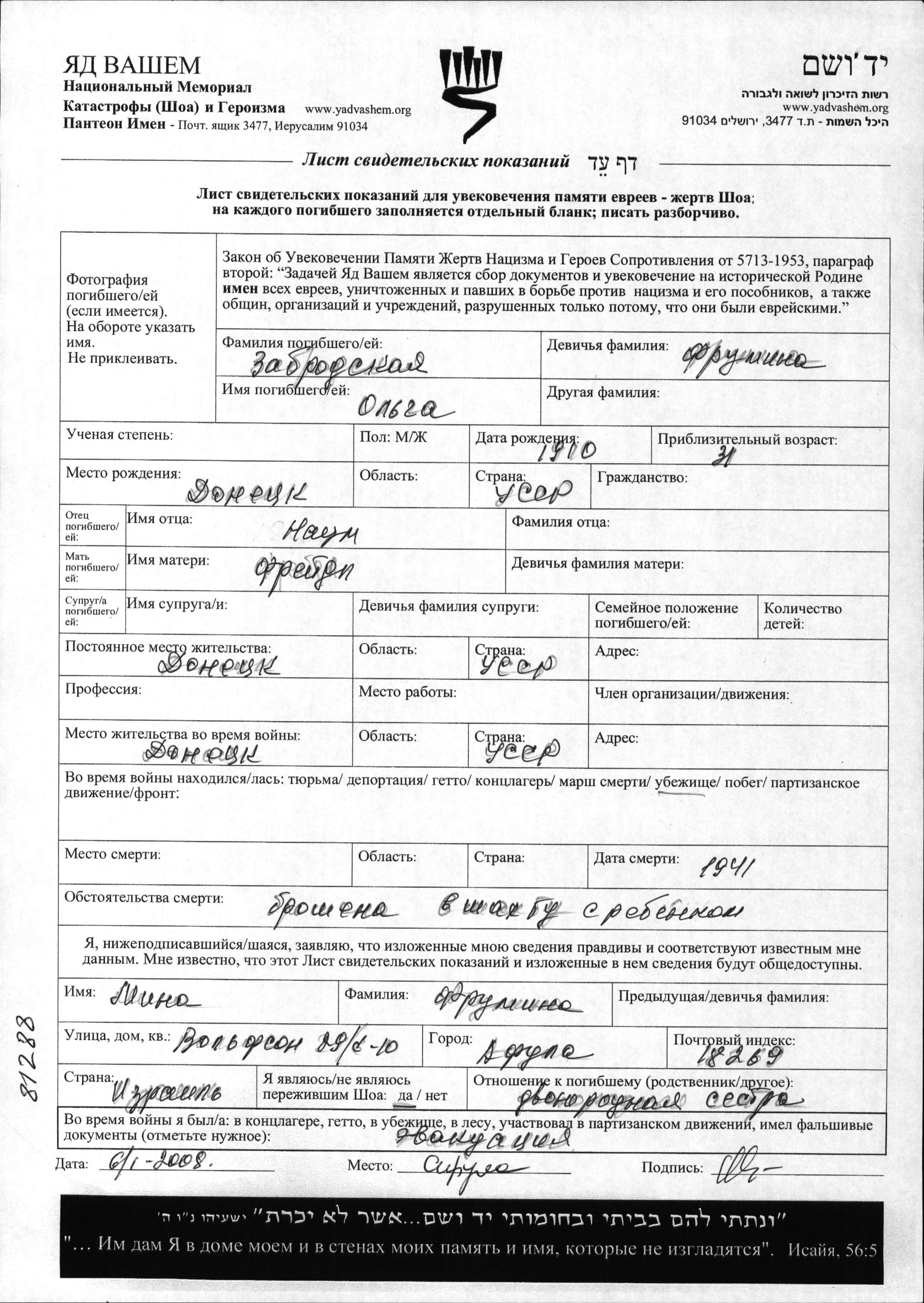 Olga Zabrodskaya, geb. Frumina wurde im Jahr 1910 in Stalino, Ukraine (UdSSR) geboren. Sie war die Tochter von Naum und Freydl. Vor dem Zweiten Weltkrieg lebte sie in Stalino, Ukraine (UdSSR). Während des Krieges war sie in Stalino, Ukraine (UdSSR).