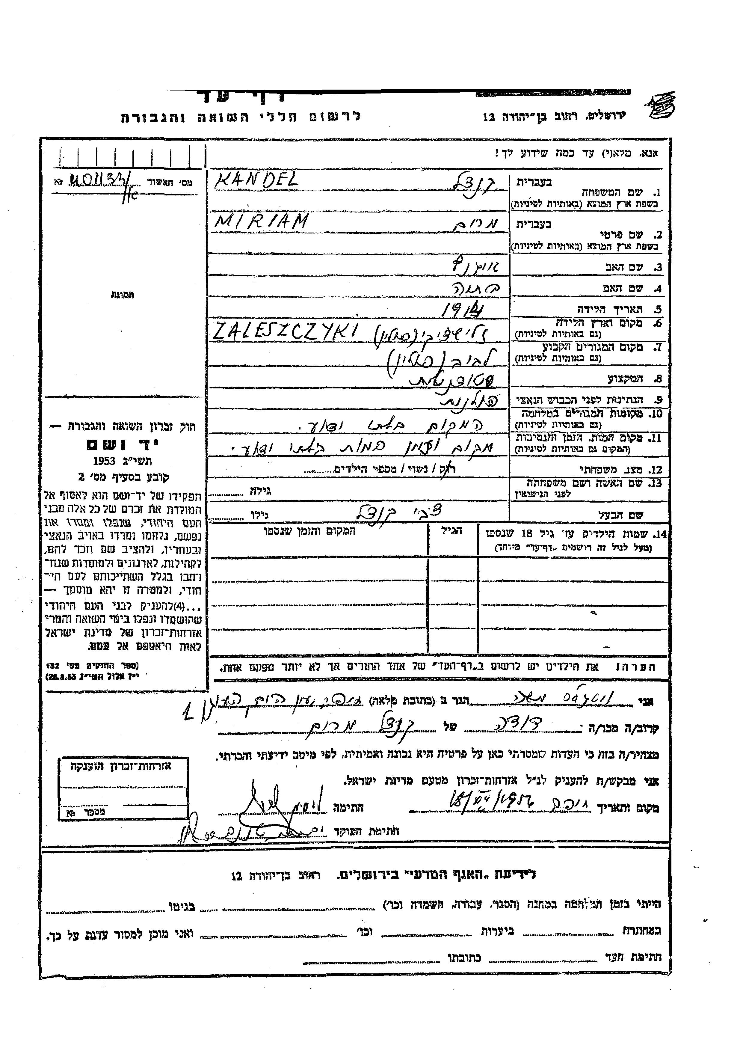 Miriam Kandel wurde im Jahr 1914 in Zaleszczyki, Polen geboren. Sie war die Tochter von Ignatz und Batia. Sie war Student und mit Tzvi Verheiratet. Vor dem Zweiten Weltkrieg lebte sie in Lwow, Polen.