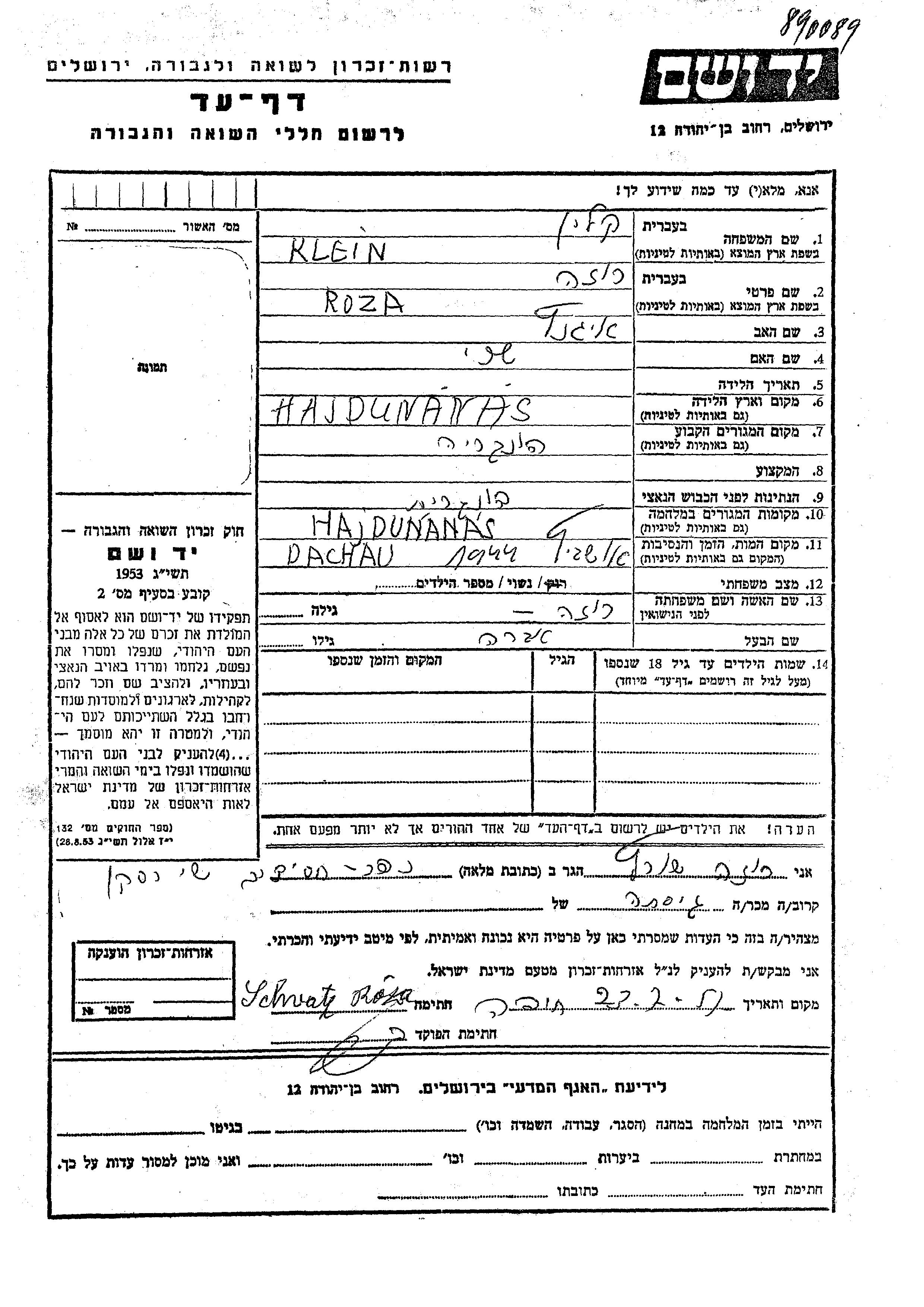 Roza Klein Kalin wurde in Hajdunanas, Ungarn geboren. Sie war die Tochter von Ignatz und Sari. Sie war mit Avraham Verheiratet. Vor dem Zweiten Weltkrieg lebte sie in Ungarn. Während des Krieges war sie in Hajdunanas, Ungarn.