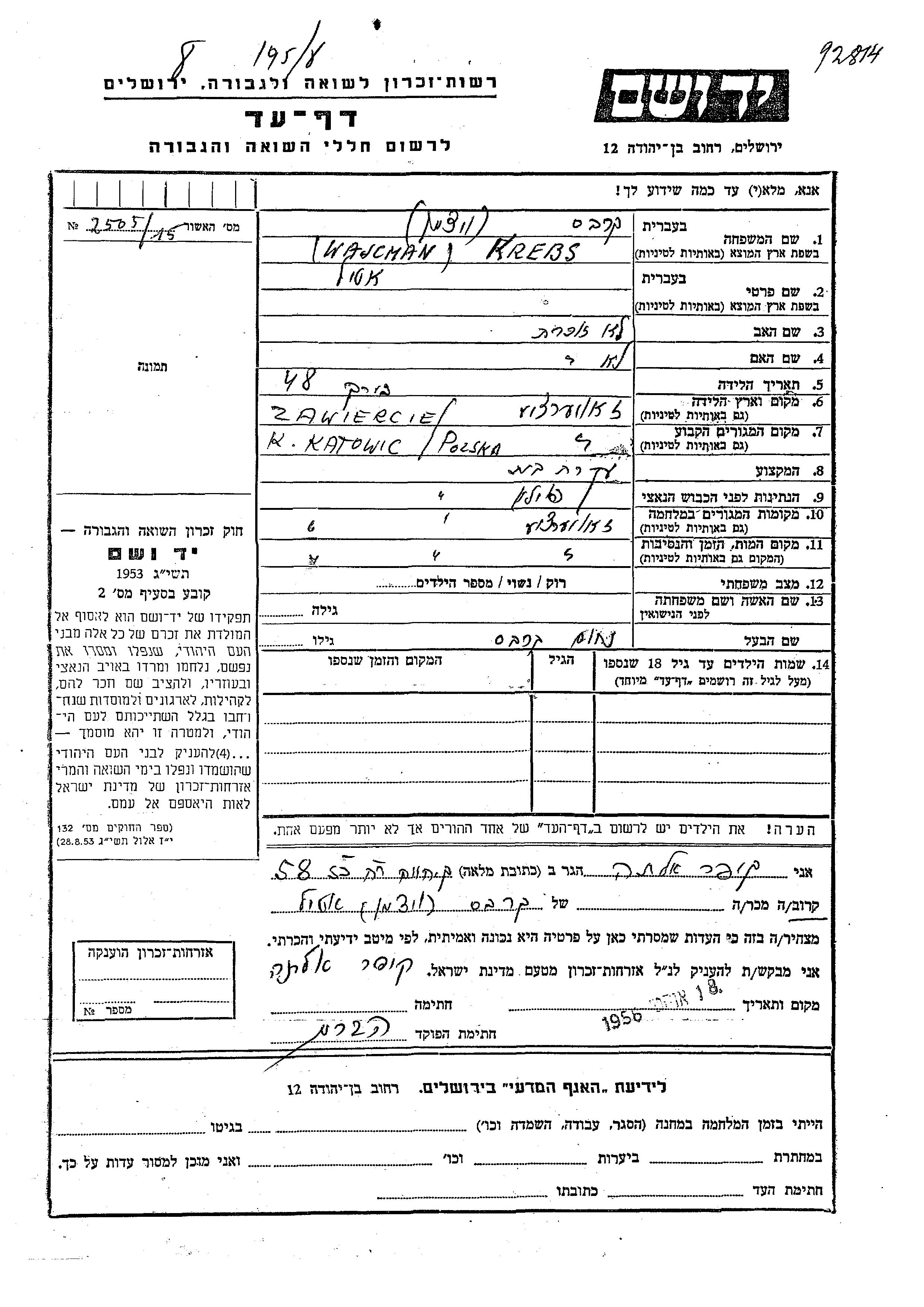 Etil Wajcman Krebs, geb. Wajcman wurde in Zawiercie, Polen geboren. Sie war Hausfrau. Vor dem Zweiten Weltkrieg lebte sie in Zawiercie, Polen. Während des Krieges war sie in Zawiercie, Polen.