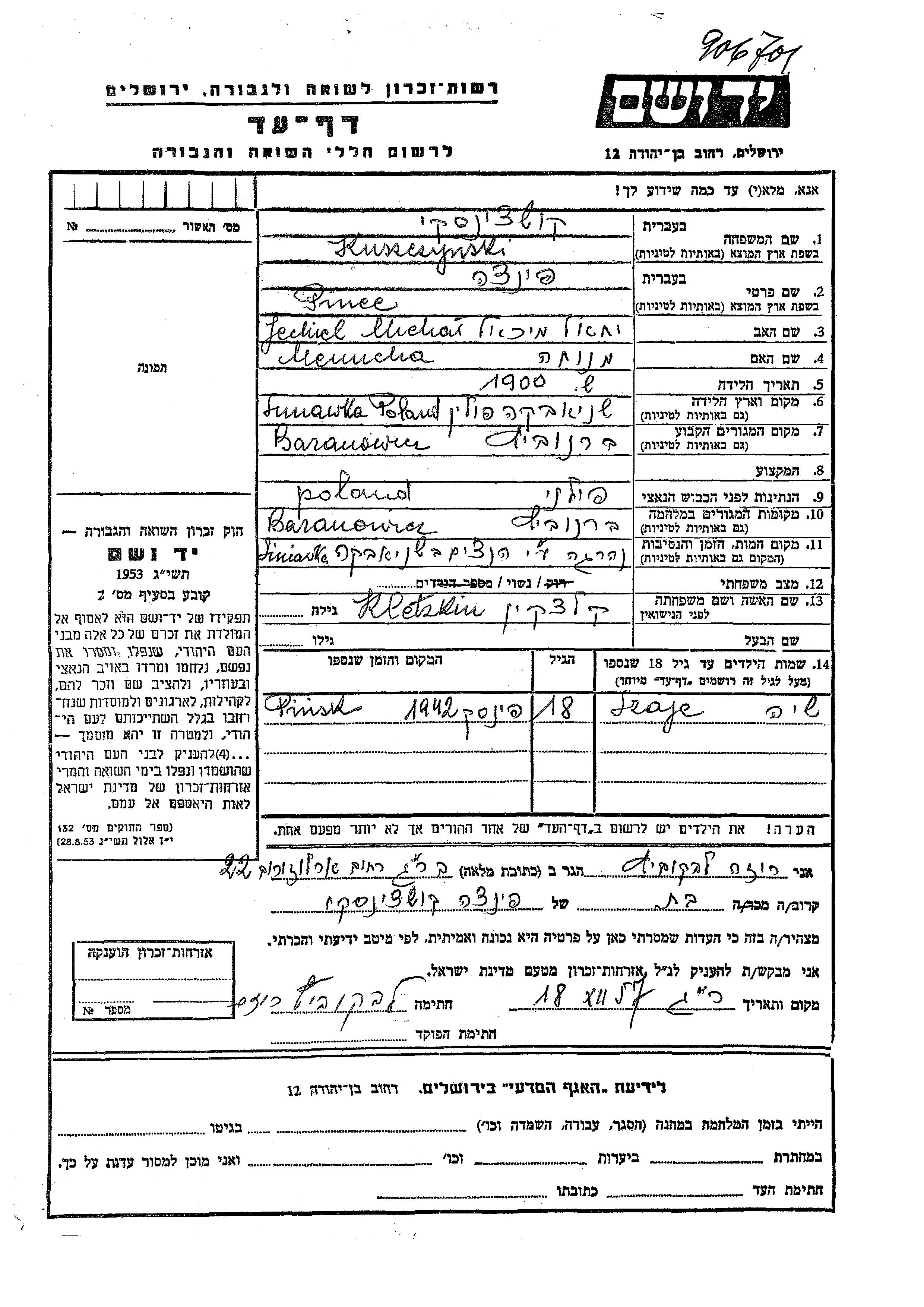 Pince Kuszczynski, geb. Kletzkin wurde im Jahr 1900 in Siniawka, Polen geboren. Sie war die Tochter von Jechiel Michal und Menucha. Sie war Verheiratet. Vor dem Zweiten Weltkrieg lebte sie in Baranowicz, Polen. Während des Krieges war sie in Baranowicz, Polen.