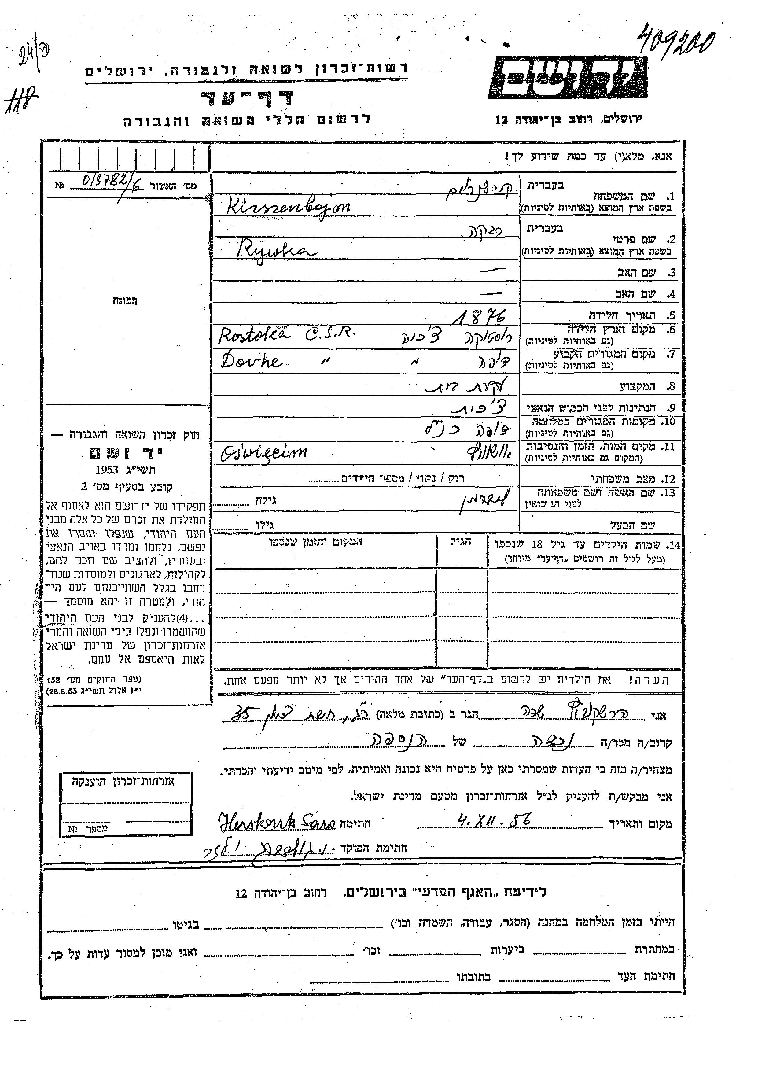 Rywka Kirszenbojm, geb. Liberman wurde im Jahr 1876 in Rostoka, Tschechoslowakei geboren. Sie war Hausfrau und Verheiratet. Vor dem Zweiten Weltkrieg lebte sie in Dovhe, Tschechoslowakei. Während des Krieges war sie in Dovhe.