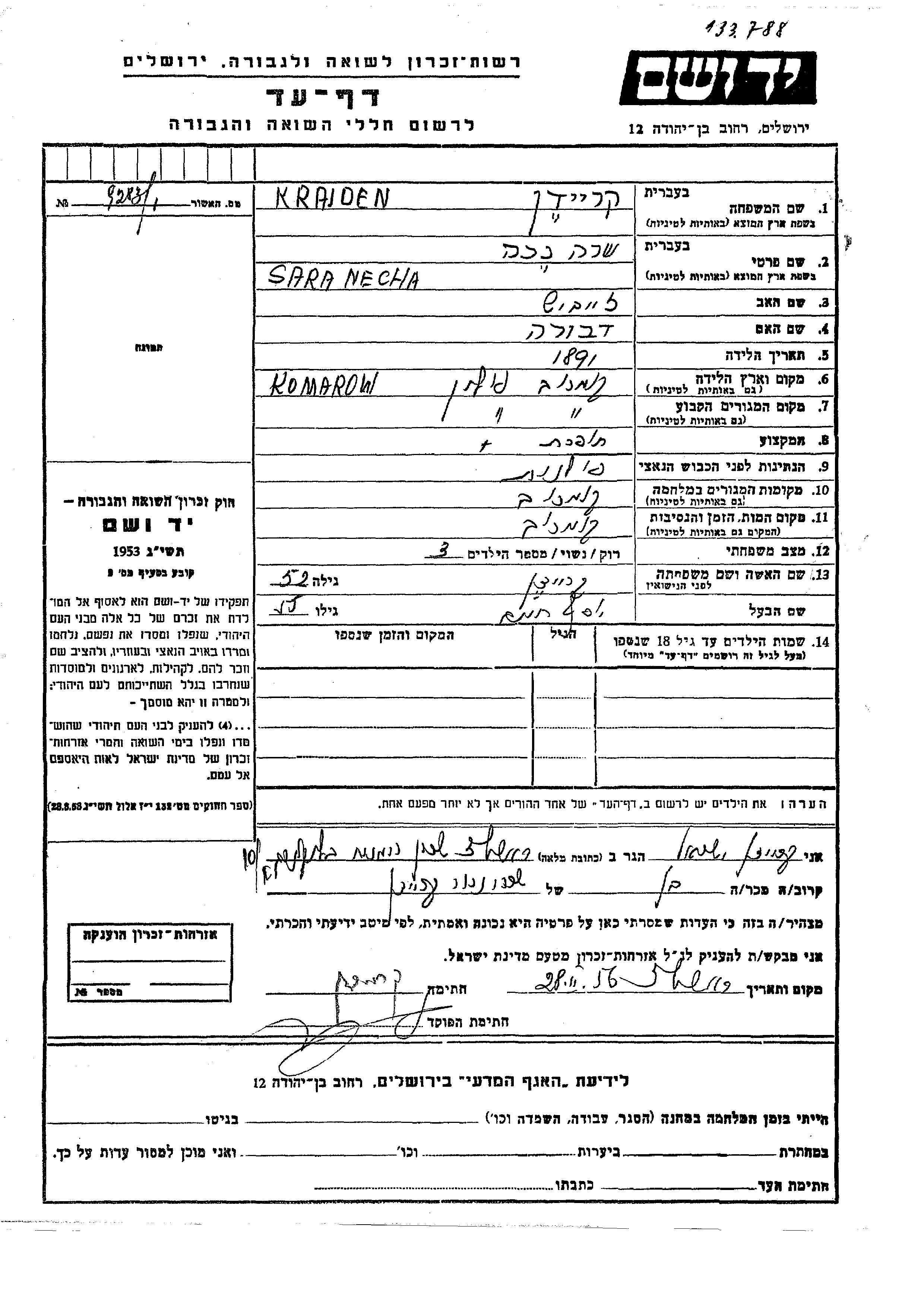 Necha Sara Krajden, geb. Kreiden wurde im Jahr 1891 in Komarow, Polen geboren. Sie war die Tochter von Leibish und Dvora. Sie war Schneiderin und mit Yosef Khaim Verheiratet. Vor dem Zweiten Weltkrieg lebte sie in Komarow, Polen. Während des Krieges war sie in Komarow, Polen.