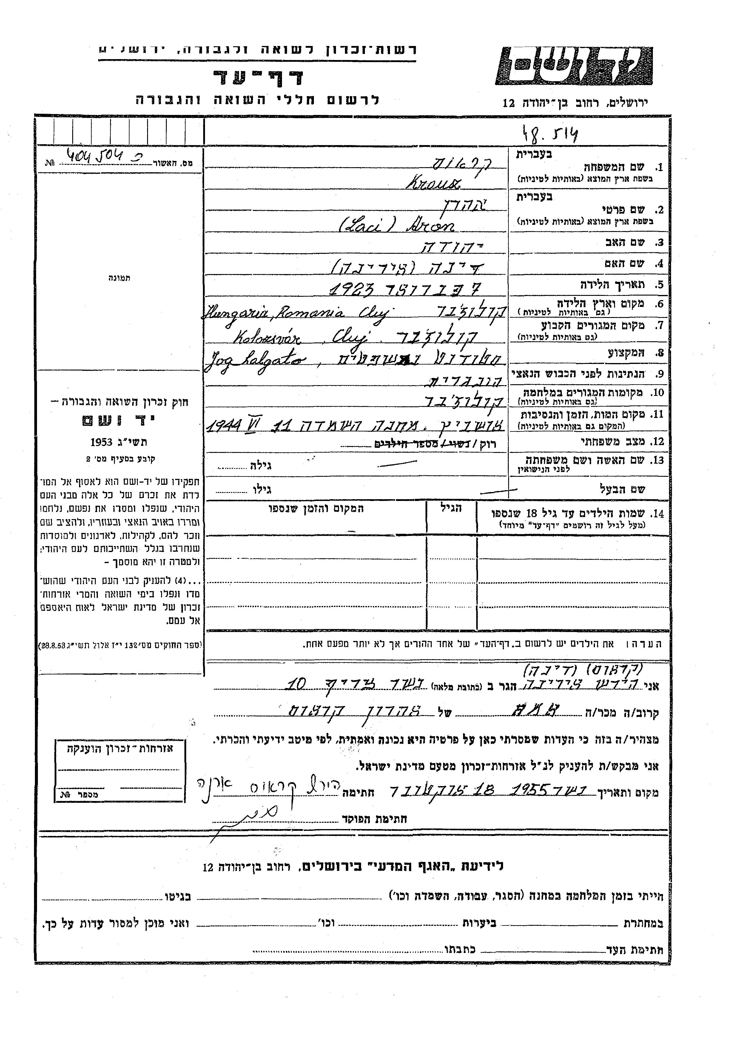 Hron Kraus wurde im Jahr 1923 in Kolozsvar, Rumänien geboren. Er war der Sohn von Yehuda und Dina Irena. Er war Jurastudent und Ledig. Vor dem Zweiten Weltkrieg lebte er in Kolozsvar, Rumänien. Während des Krieges war er in Kolozsvar, Rumänien.