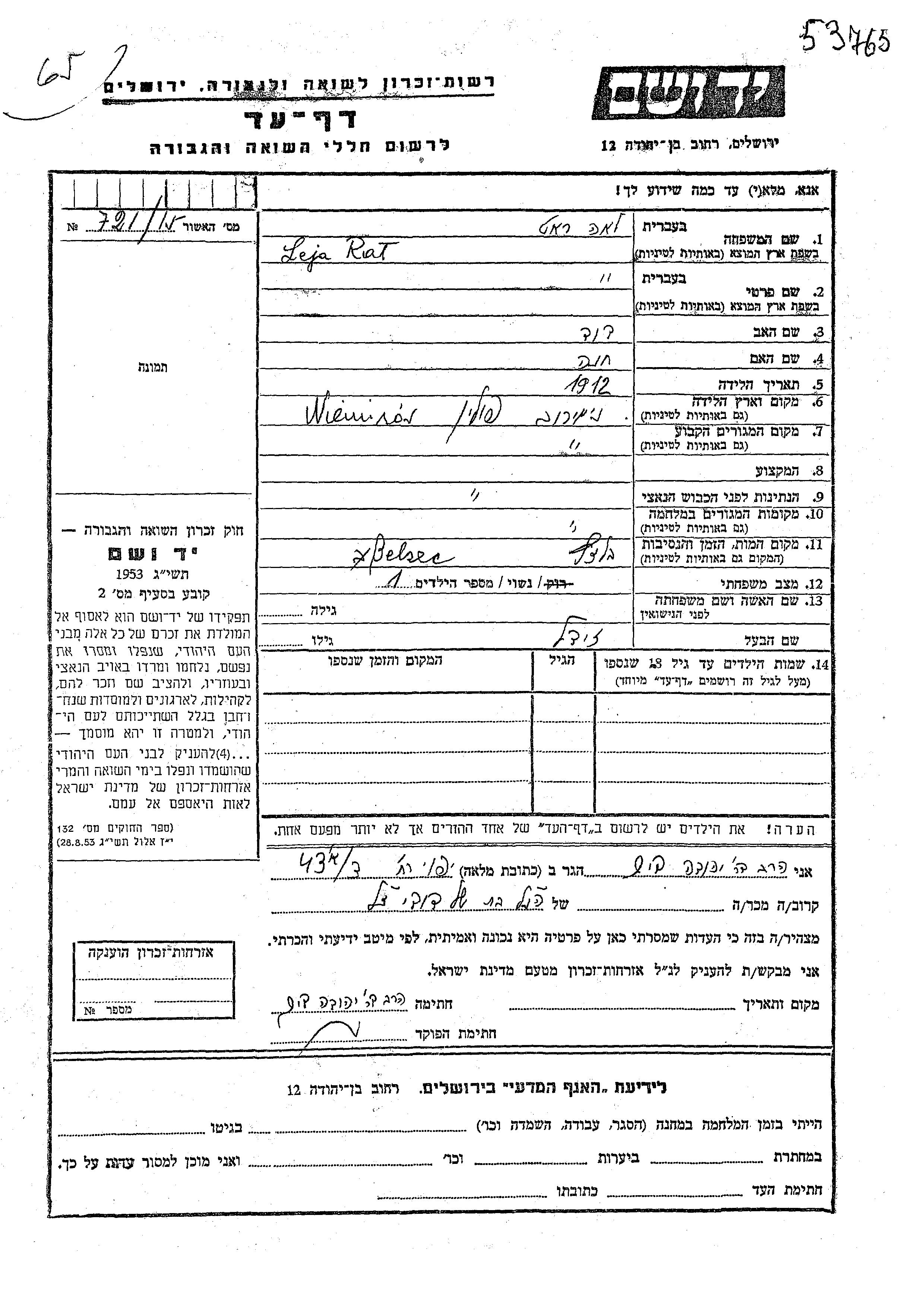 Leja Rat wurde im Jahr 1912 in Niemirov, Polen geboren. Sie war die Tochter von David und Khana. Sie war mit Zeidel Verheiratet. Vor dem Zweiten Weltkrieg lebte sie in Niemirov, Polen. Während des Krieges war sie in Niemirov, Polen.