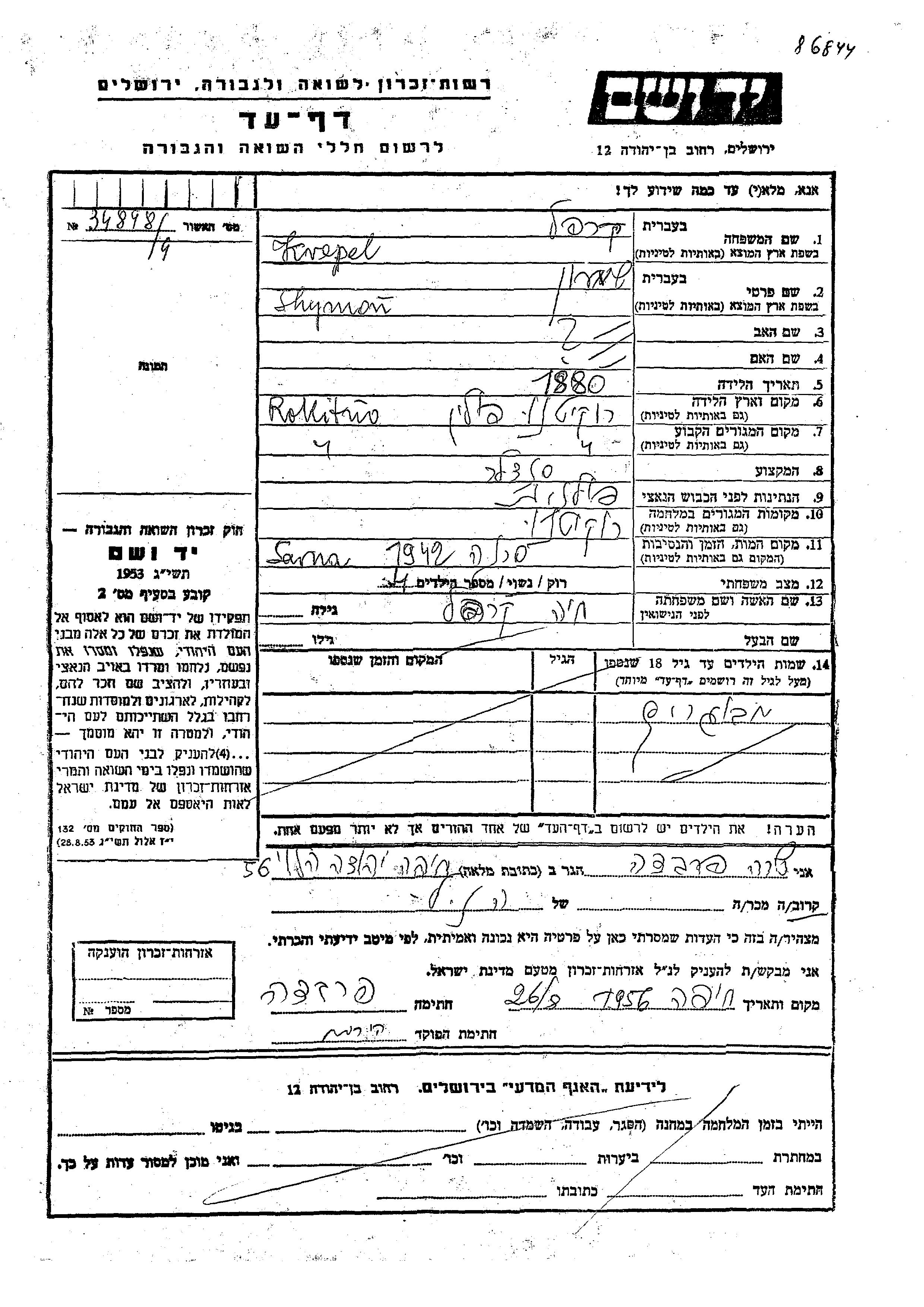 Shymon Krepel Karpel wurde im Jahr 1880 in Rokitno, Polen geboren. Er war Schuster/-in und mit Khaia Verheiratet. Vor dem Zweiten Weltkrieg lebte er in Rokitno, Polen. Während des Krieges war er in Rokitno, Polen.