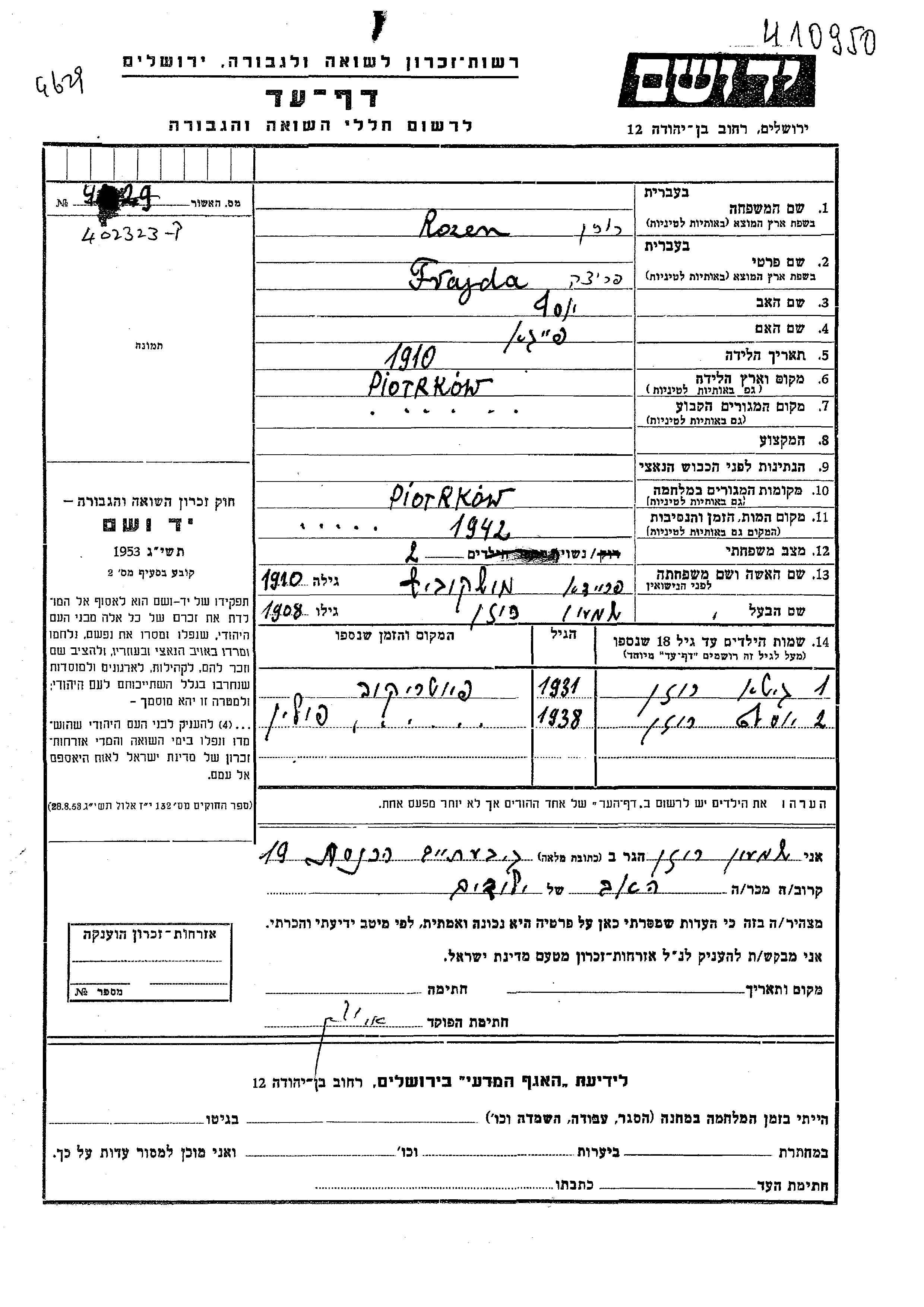 Frajda Rozen, geb. Moshkovitz wurde im Jahr 1910 in Piotrkow, Polen geboren. Sie war die Tochter von Yosef und Feiga. Sie war mit Shimon Verheiratet. Vor dem Zweiten Weltkrieg lebte sie in Piotrkow, Polen. Während des Krieges war sie in Piotrkow, Polen.