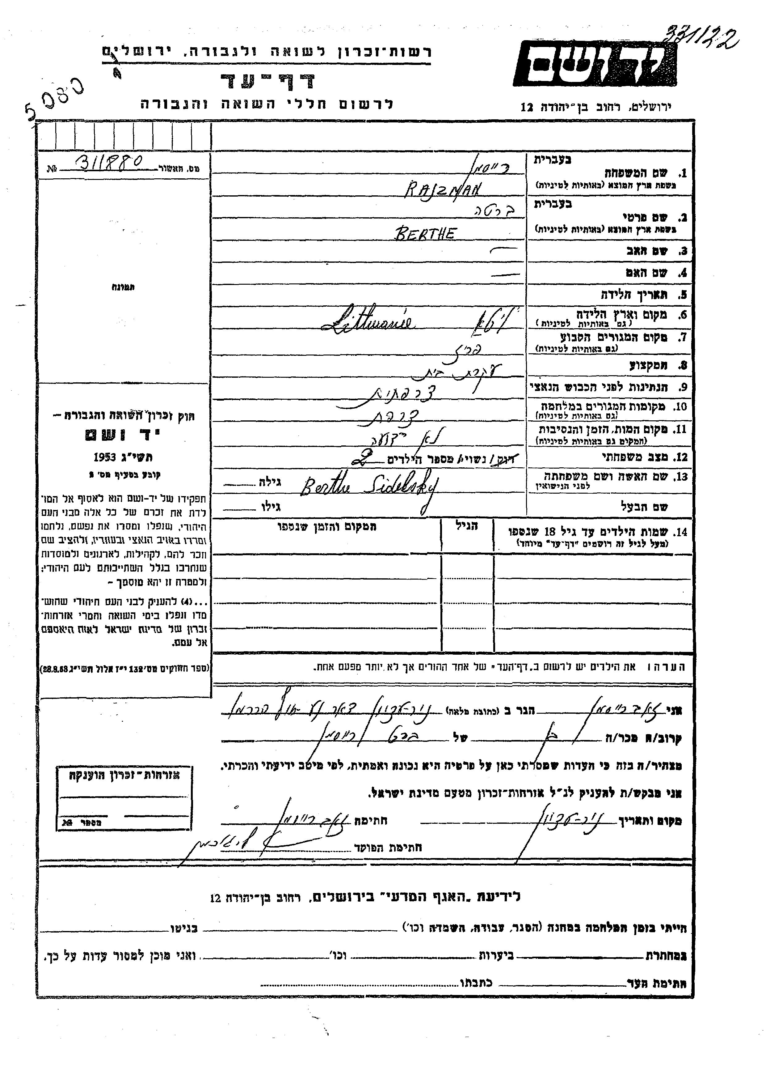 Berthe Rajzman, geb. Sidelsky wurde in Litauen geboren. Sie war Hausfrau und Verheiratet. Vor dem Zweiten Weltkrieg lebte sie in Paris, Frankreich. Während des Krieges war sie in Frankreich.