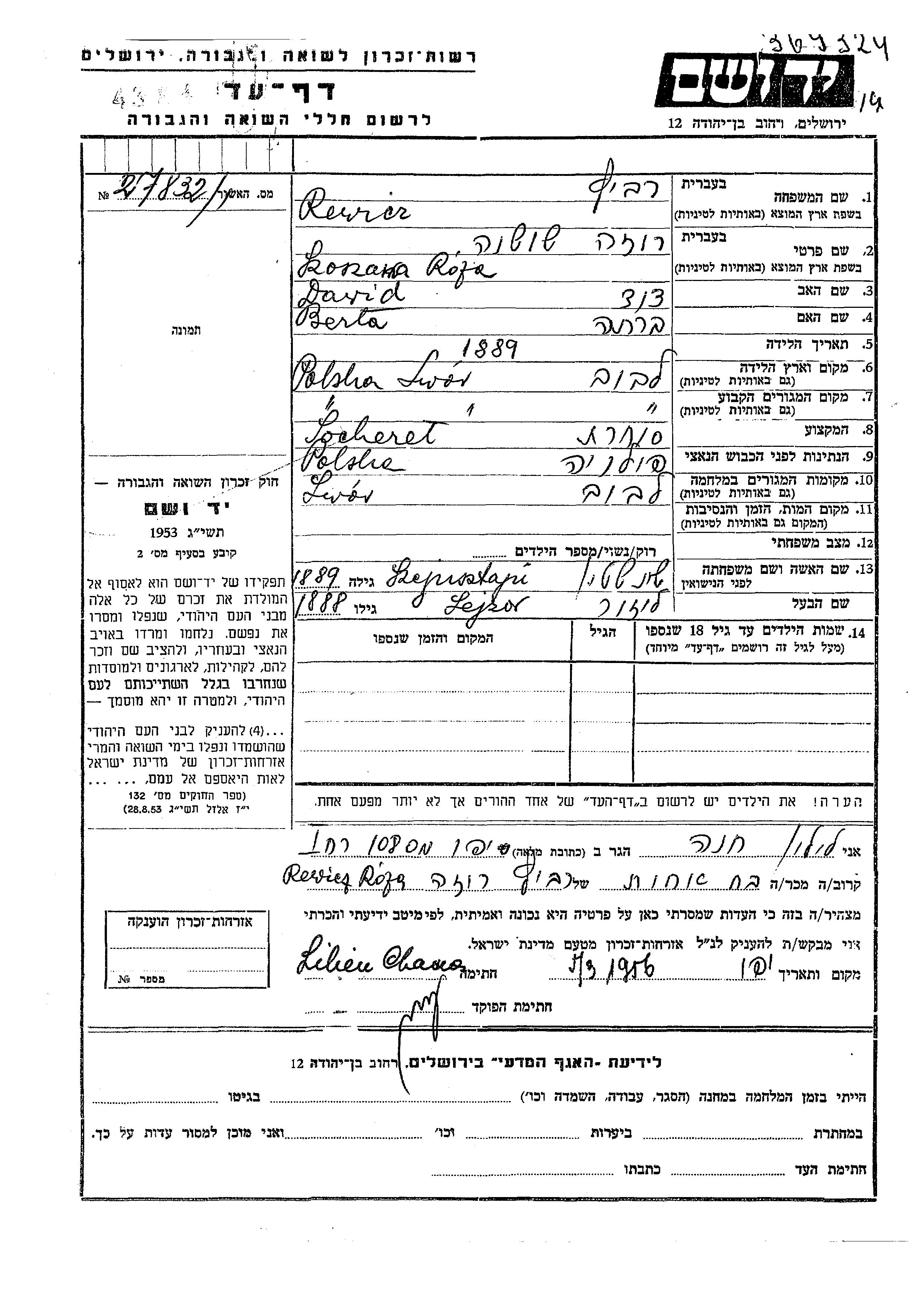 Szoszana Roza Rewicz Ravich, geb. Szejnsztajn wurde im Jahr 1889 in Lwow, Polen geboren. Sie war die Tochter von Dawid und Berta. Sie war Kaufmann/-frau. Vor dem Zweiten Weltkrieg lebte sie in Lwow, Polen. Während des Krieges war sie in Lwow, Polen.