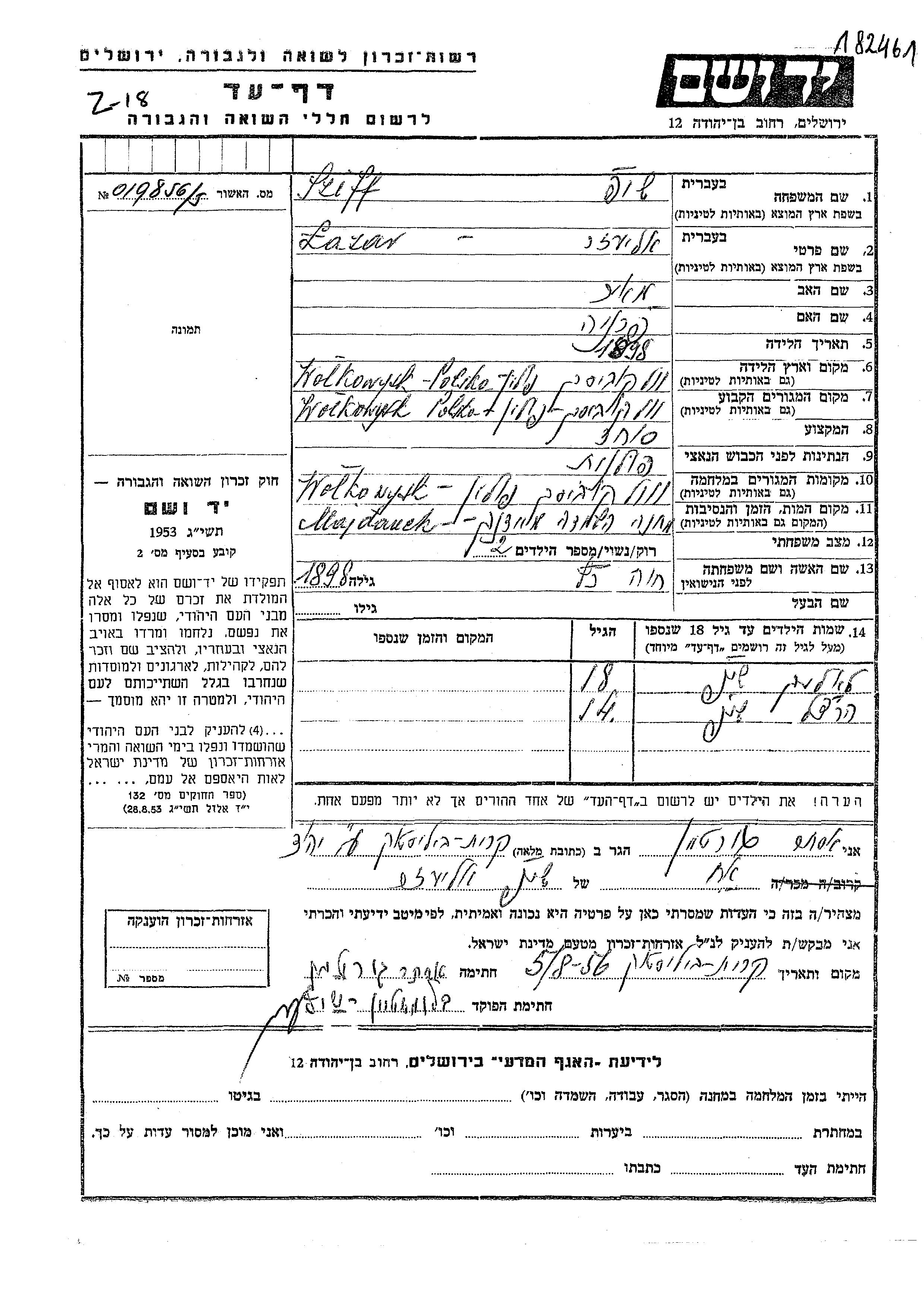 Lazar Sziff Ship wurde im Jahr 1898 in Wolkowysk, Polen geboren. Er war der Sohn von Meir und Frina. Er war Kaufmann/-frau und mit Khava, geb. Katz Verheiratet. Vor dem Zweiten Weltkrieg lebte er in Wolkowysk, Polen. Während des Krieges war er in Wolkowysk, Polen.
