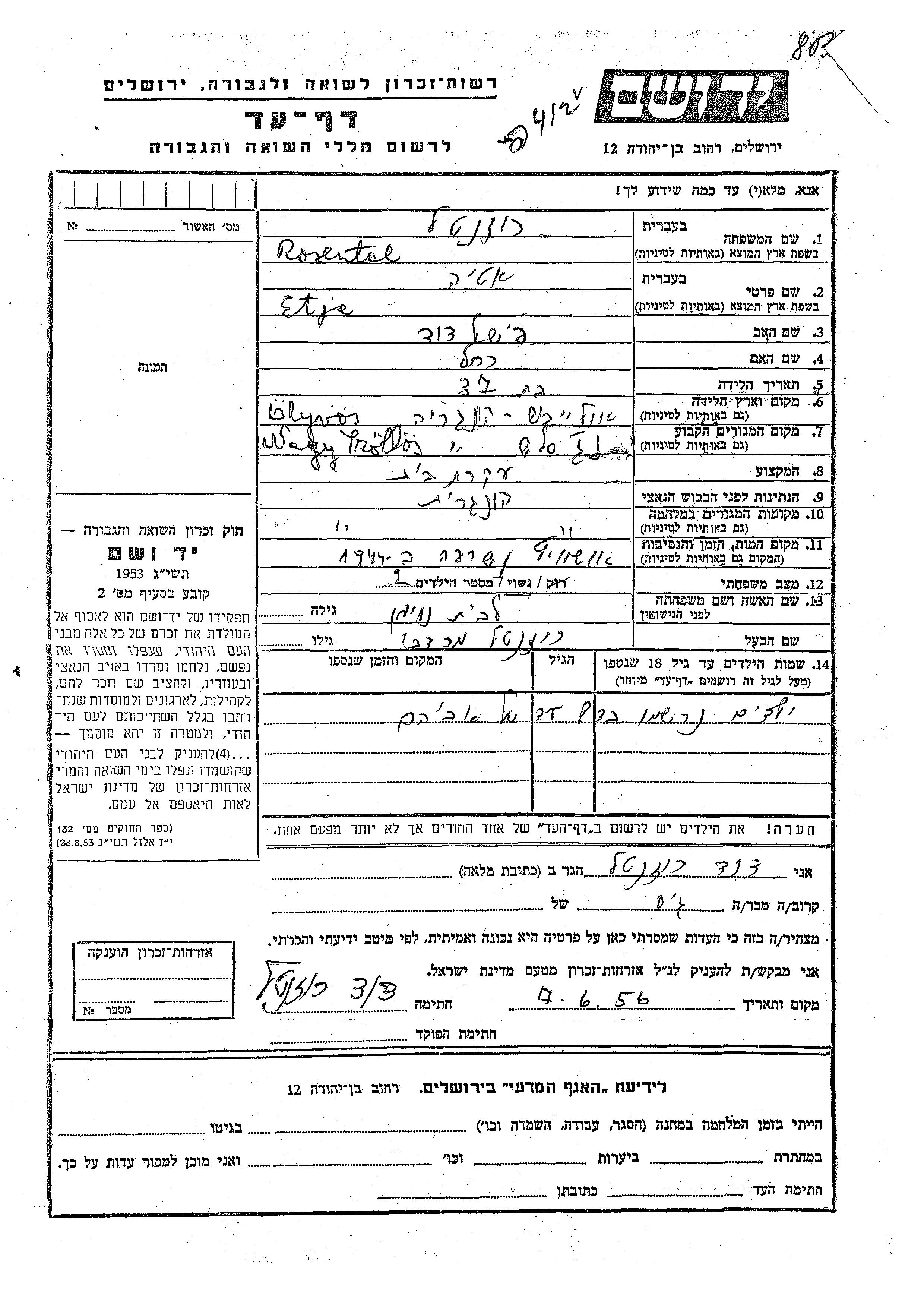 Etja Rosental, geb. Noiman wurde in Olyvos geboren. Sie war die Tochter von Fishel David und Rakhel. Sie war Hausfrau und mit Mordekhai Verheiratet. Vor dem Zweiten Weltkrieg lebte sie in Szollos, Tschechoslowakei. Während des Krieges war sie in Szollos, Tschechoslowakei.