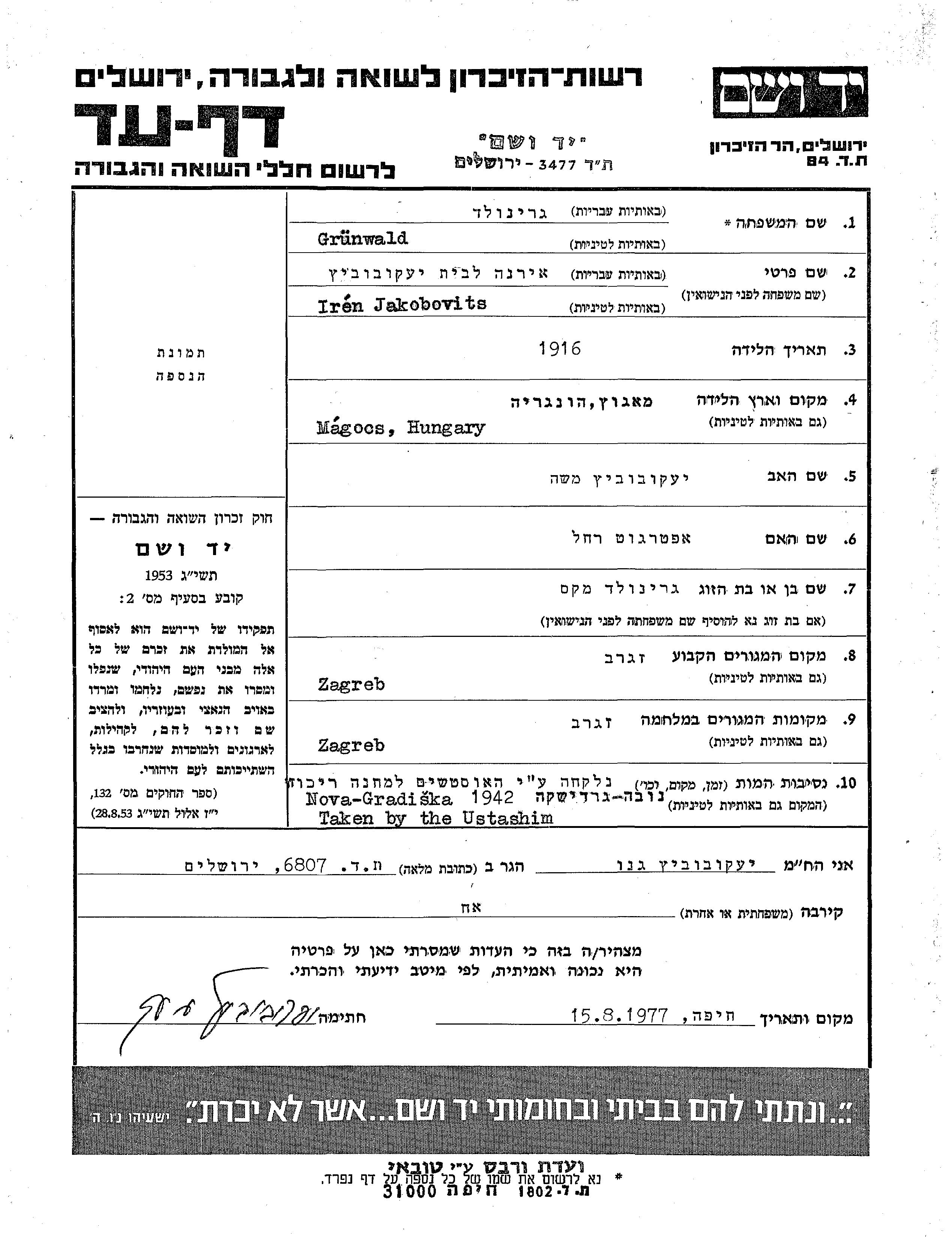 Iren Grunwald, geb. Jakobovitz wurde im Jahr 1916 in Magocs, Ungarn geboren. Sie war die Tochter von Moshe und Rakhel. Sie war mit Max Verheiratet. Vor dem Zweiten Weltkrieg lebte sie in Zagreb, Jugoslawien. Während des Krieges war sie in Zagreb, Jugoslawien.