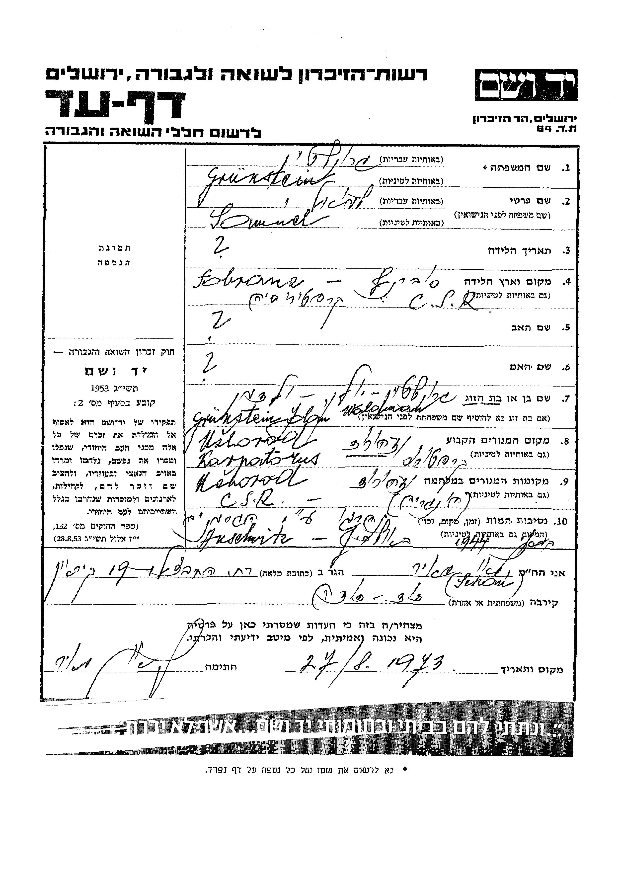 Somuel Grünstein Grundshtein wurde in Sobrance, Tschechoslowakei geboren. Er war mit Jolan, geb. Waldman Verheiratet. Vor dem Zweiten Weltkrieg lebte er in Uzhorod, Tschechoslowakei. Während des Krieges war er in Uzhorod, Tschechoslowakei.