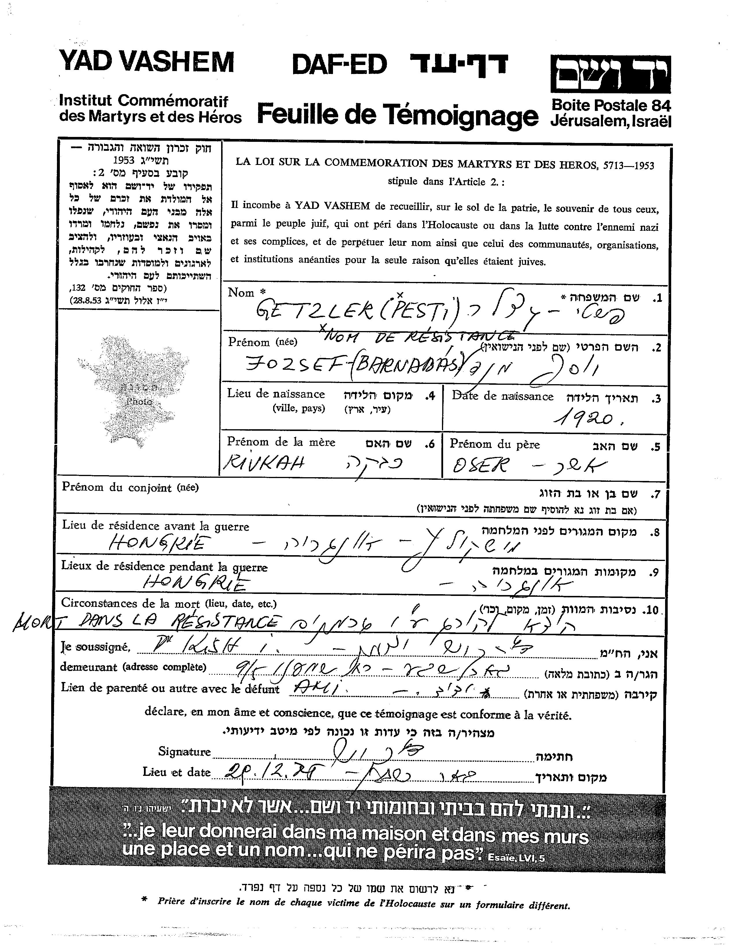 Jozsef Barnabas Mendel Pesti Getzler Pesati wurde im Jahr 1920 geboren. Er war der Sohn von Oser und Rivkah. Vor dem Zweiten Weltkrieg lebte er in Miskolc, Ungarn. Während des Krieges war er in Ungarn.