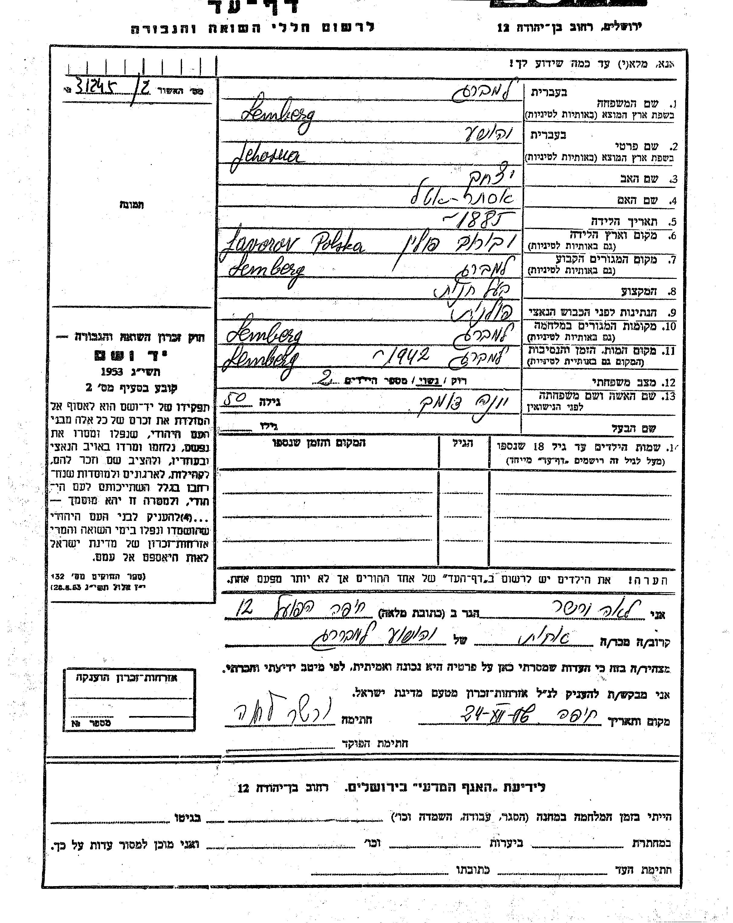 Jehosua Lemberg wurde im Jahr 1885 in Jaworow, Polen geboren. Er war der Sohn von Yitzkhak und Ester. Er war Ladenbesitzer/-in und mit Yona, geb. Chumak Verheiratet. Vor dem Zweiten Weltkrieg lebte er in Lemberg, Polen. Während des Krieges war er in Lemberg, Polen.