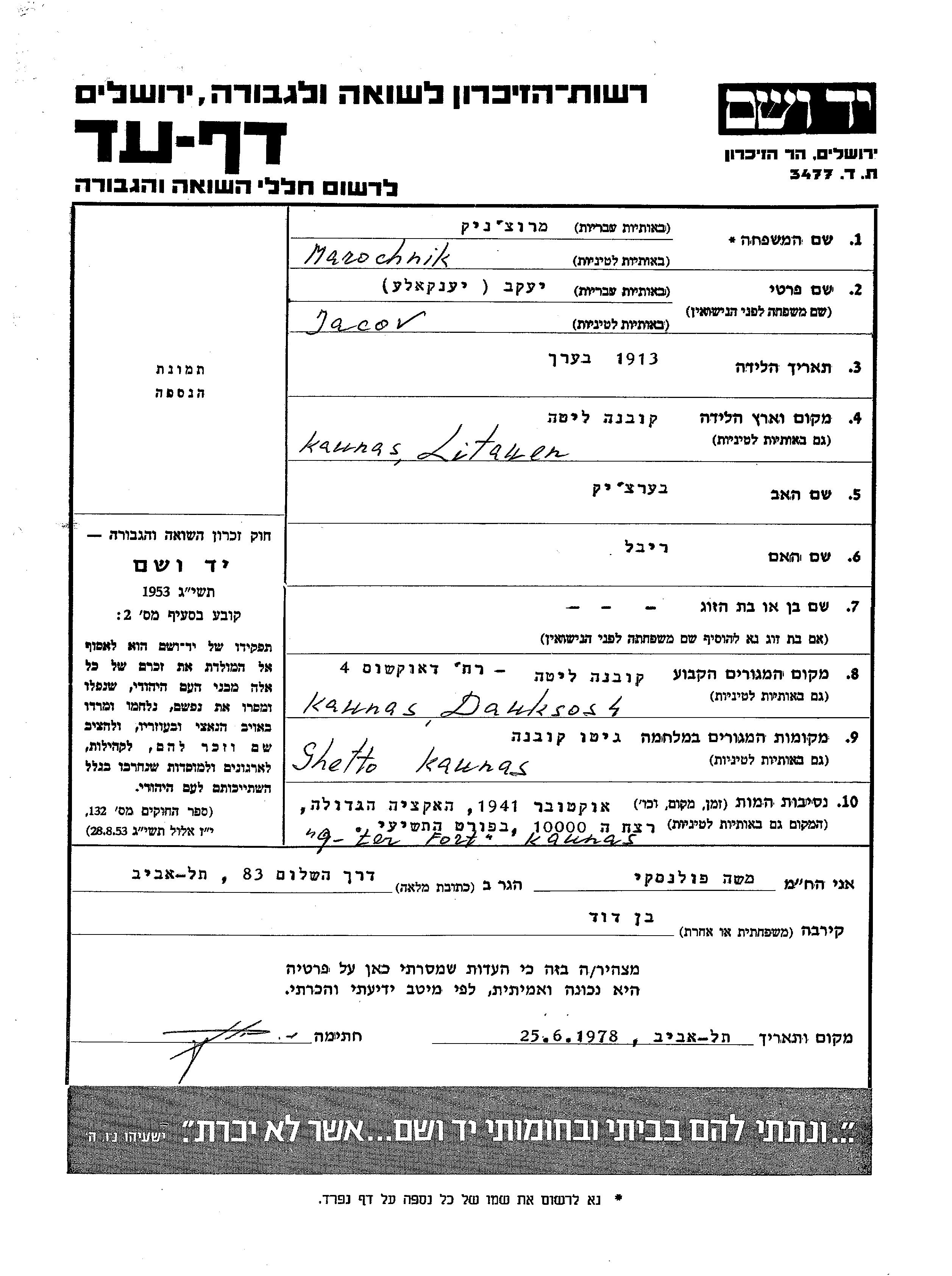 Jacov Marochnik wurde im Jahr 1913 in Kaunas, Litauen geboren. Er war der Sohn von Ber und Rivl. Vor dem Zweiten Weltkrieg lebte er in Kaunas, Litauen. Während des Krieges war er in Kaunas, Litauen.