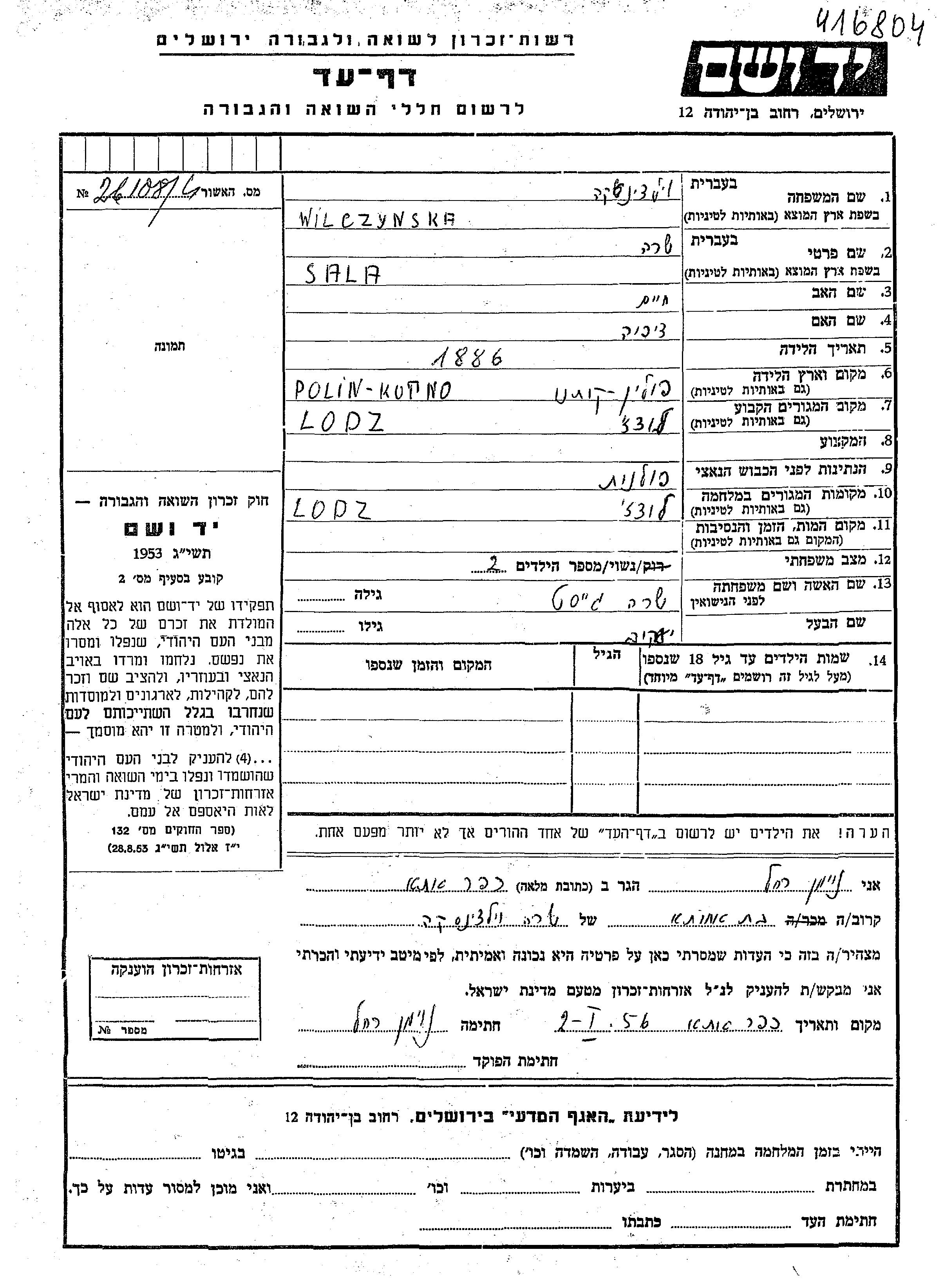 Sala Sara Wilczynska, geb. Geist wurde im Jahr 1886 in Kutno, Polen geboren. Sie war die Tochter von Khaim und Tzipora. Sie war mit Yaakov Verheiratet. Vor dem Zweiten Weltkrieg lebte sie in Lodz, Polen. Während des Krieges war sie in Lodz, Polen.
