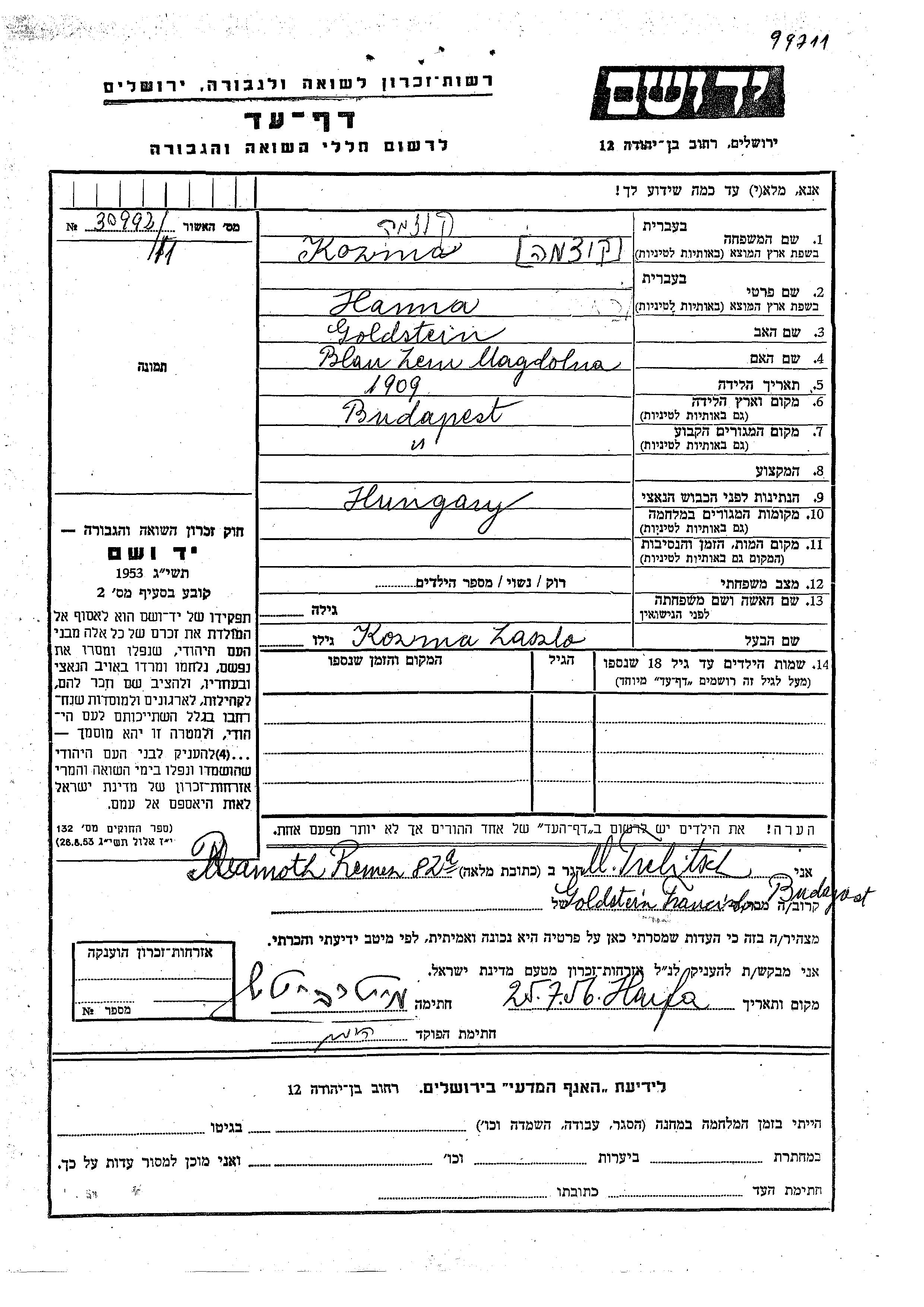 Hanna Kozma, geb. Goldstein wurde im Jahr 1909 in Budapest, Ungarn geboren. Sie war die Tochter von Zheni Magdolna. Sie war mit Laszlo Verheiratet. Vor dem Zweiten Weltkrieg lebte sie in Budapest, Ungarn.