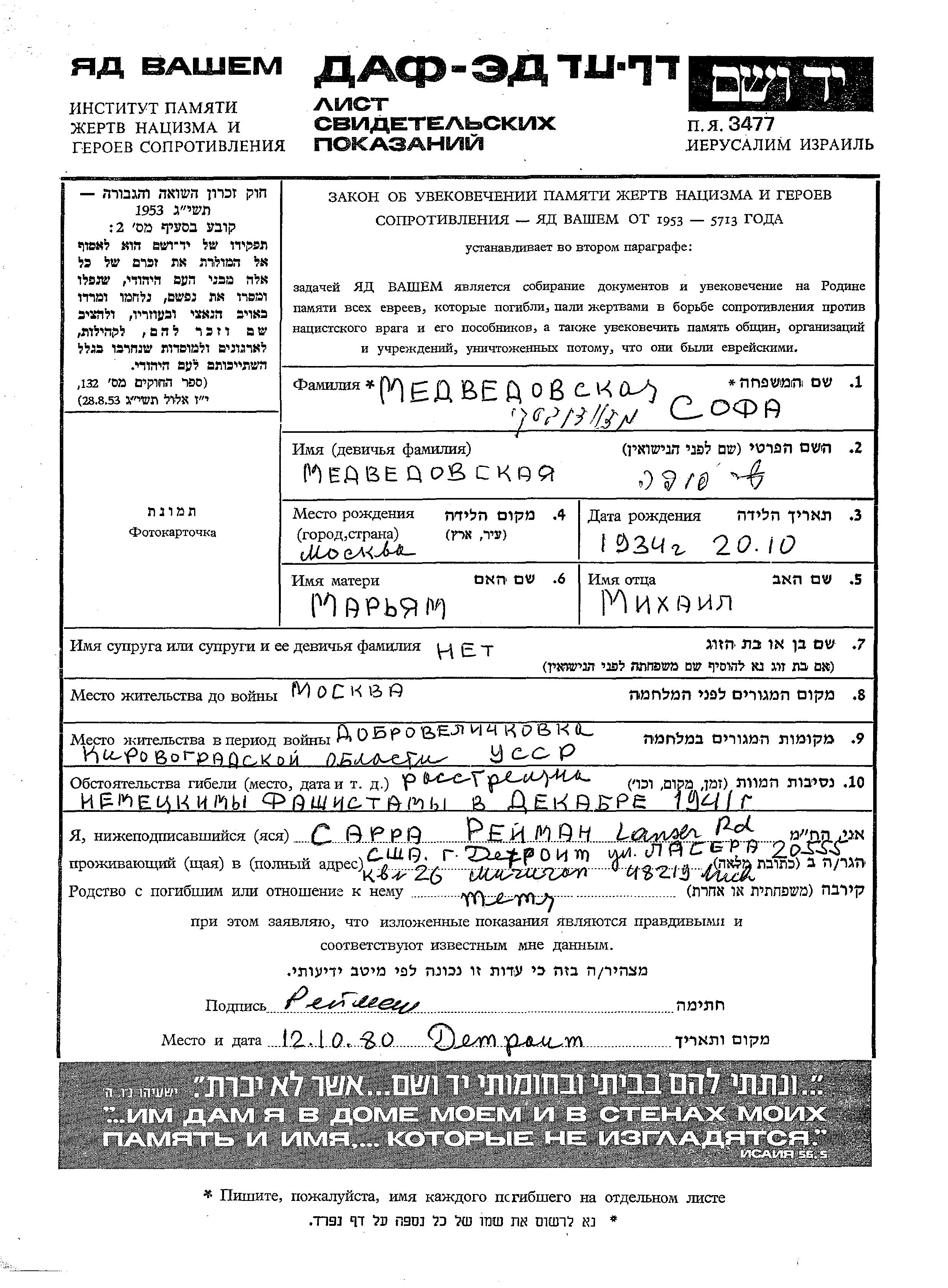 Sofa Medvedovski wurde im Jahr 1934 in Moskva, Russland (UdSSR) geboren. Sie war die Tochter von Mikhail und Maryam. Sie war Ledig. Vor dem Zweiten Weltkrieg lebte sie in Moskva, Russland (UdSSR). Während des Krieges war sie in Dobrovelichkivka, Ukraine (UdSSR).