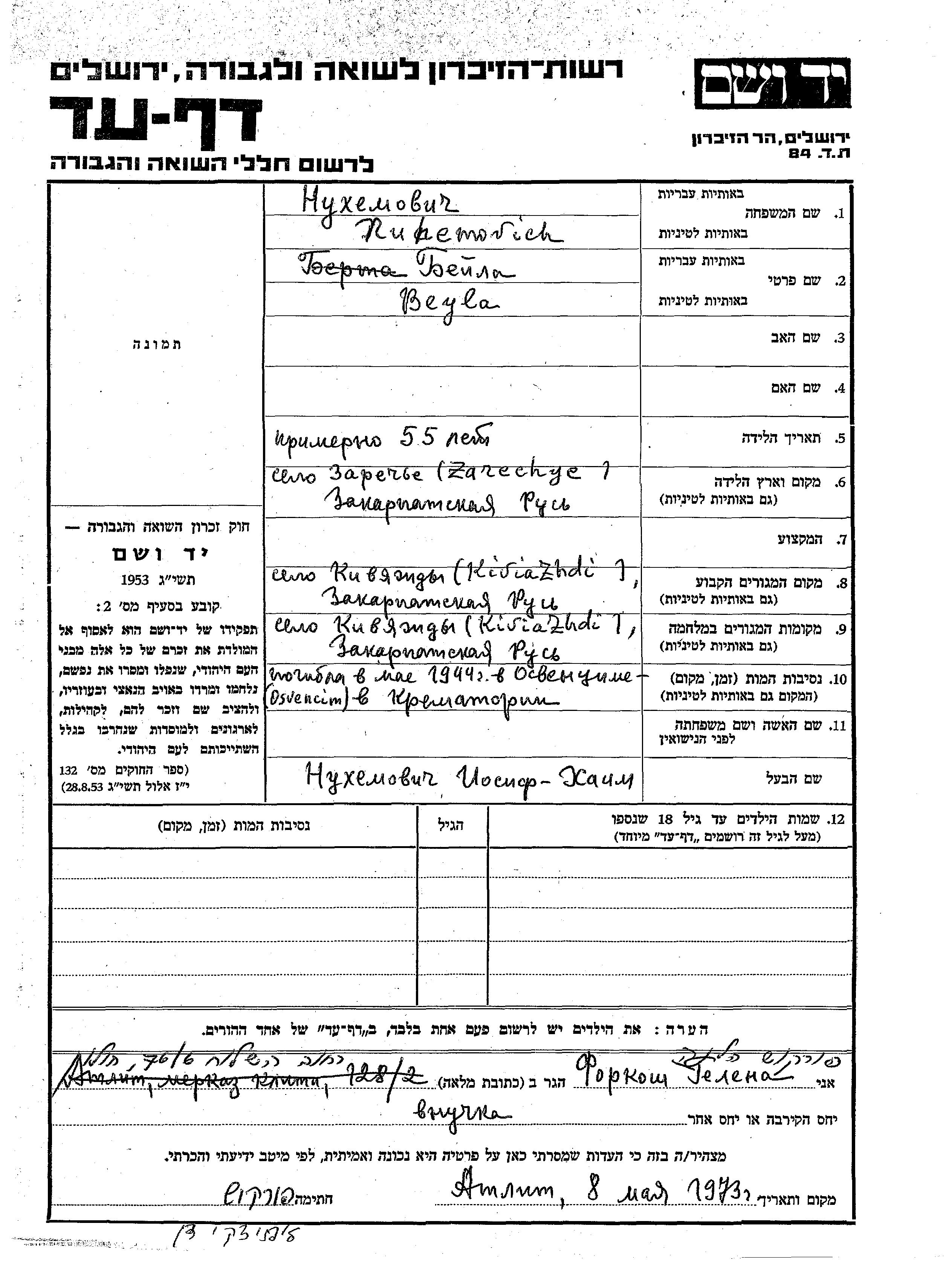 Beyla Nuhemovich wurde in Zareci, Tschechoslowakei geboren. Sie war mit Iosif Khaim Verheiratet. Vor dem Zweiten Weltkrieg lebte sie in Kivjazd, Tschechoslowakei. Während des Krieges war sie in Kivjazsd, Tschechoslowakei.