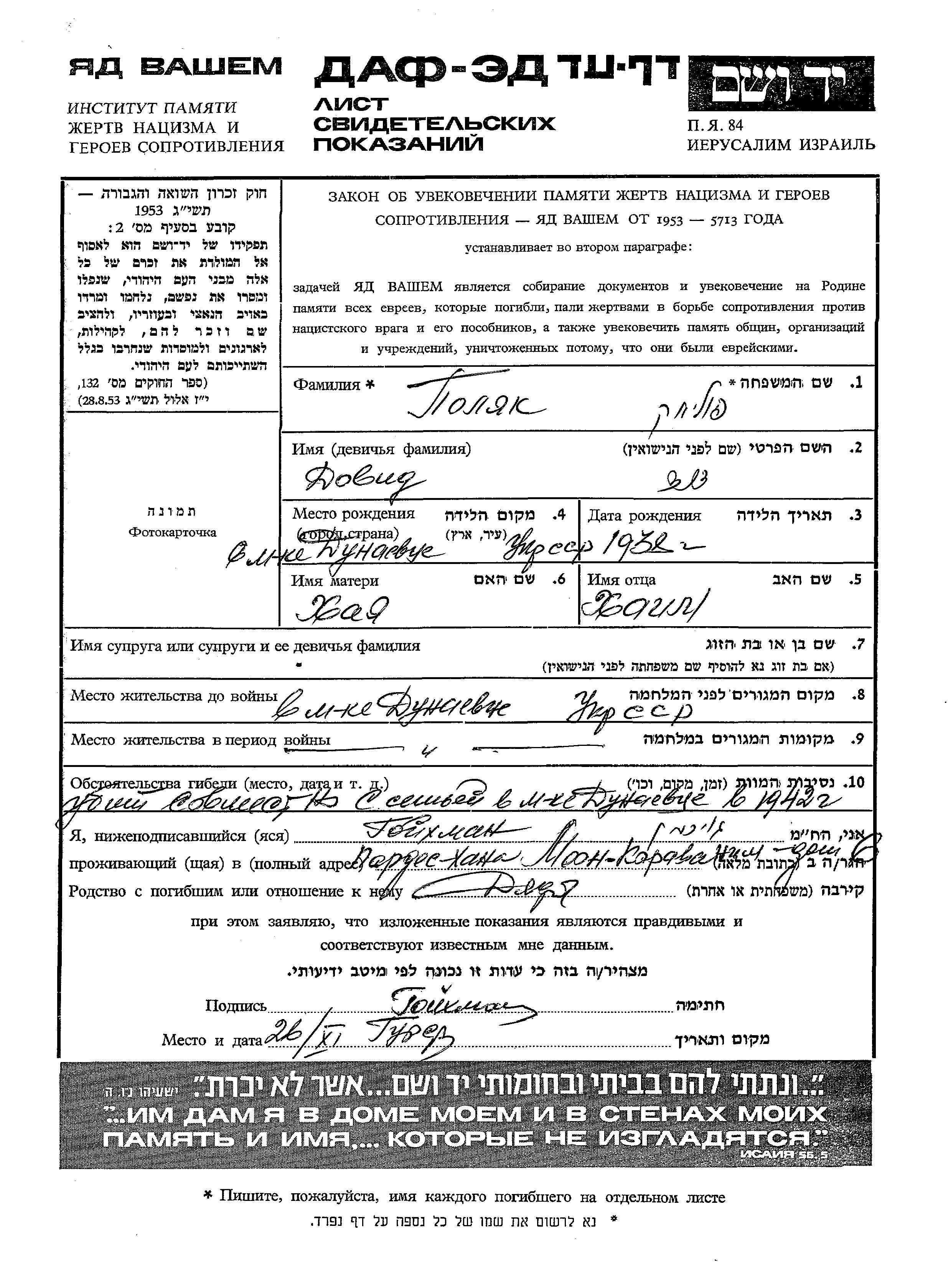 Poliak Dovid 1938 Dunajevcy, Ukraine (UdSSR) Gedenkblatt