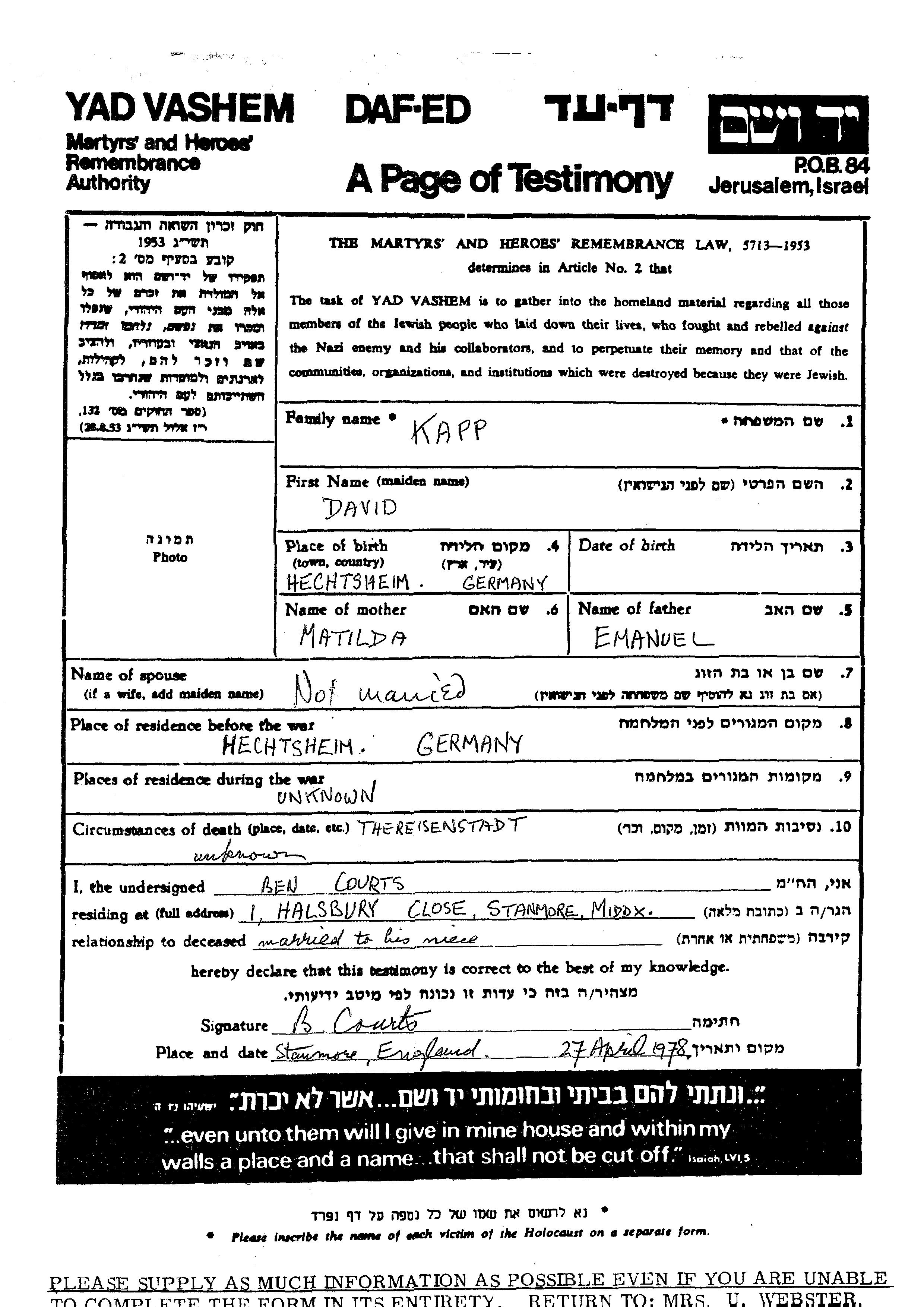 David wurde in der Schoah ermordet. Todesort: Theresienstadt, Tschechoslowakei.