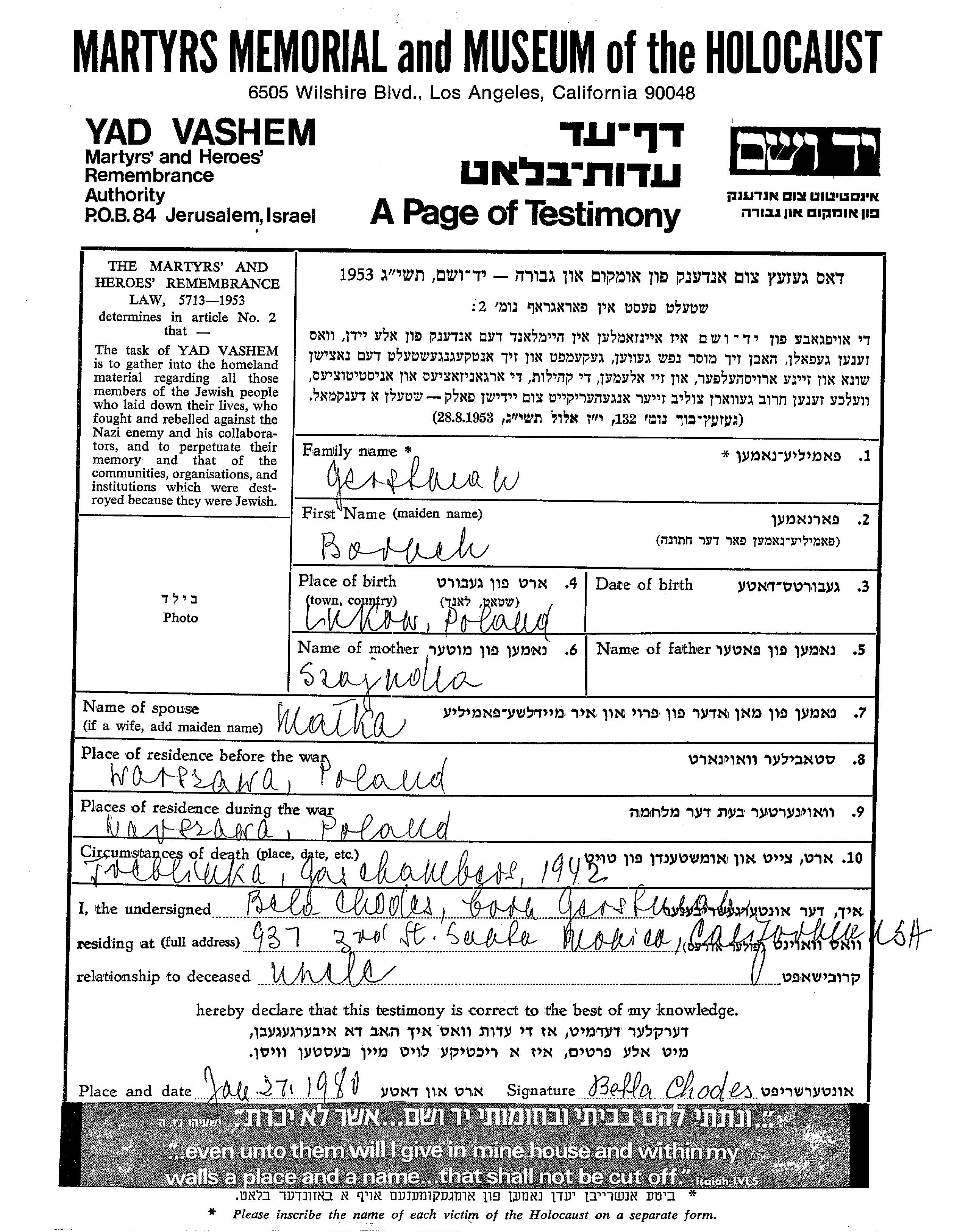 Boruch wurde in der Schoah ermordet. Todesort: Treblinka, Polen im Jahr 1942.