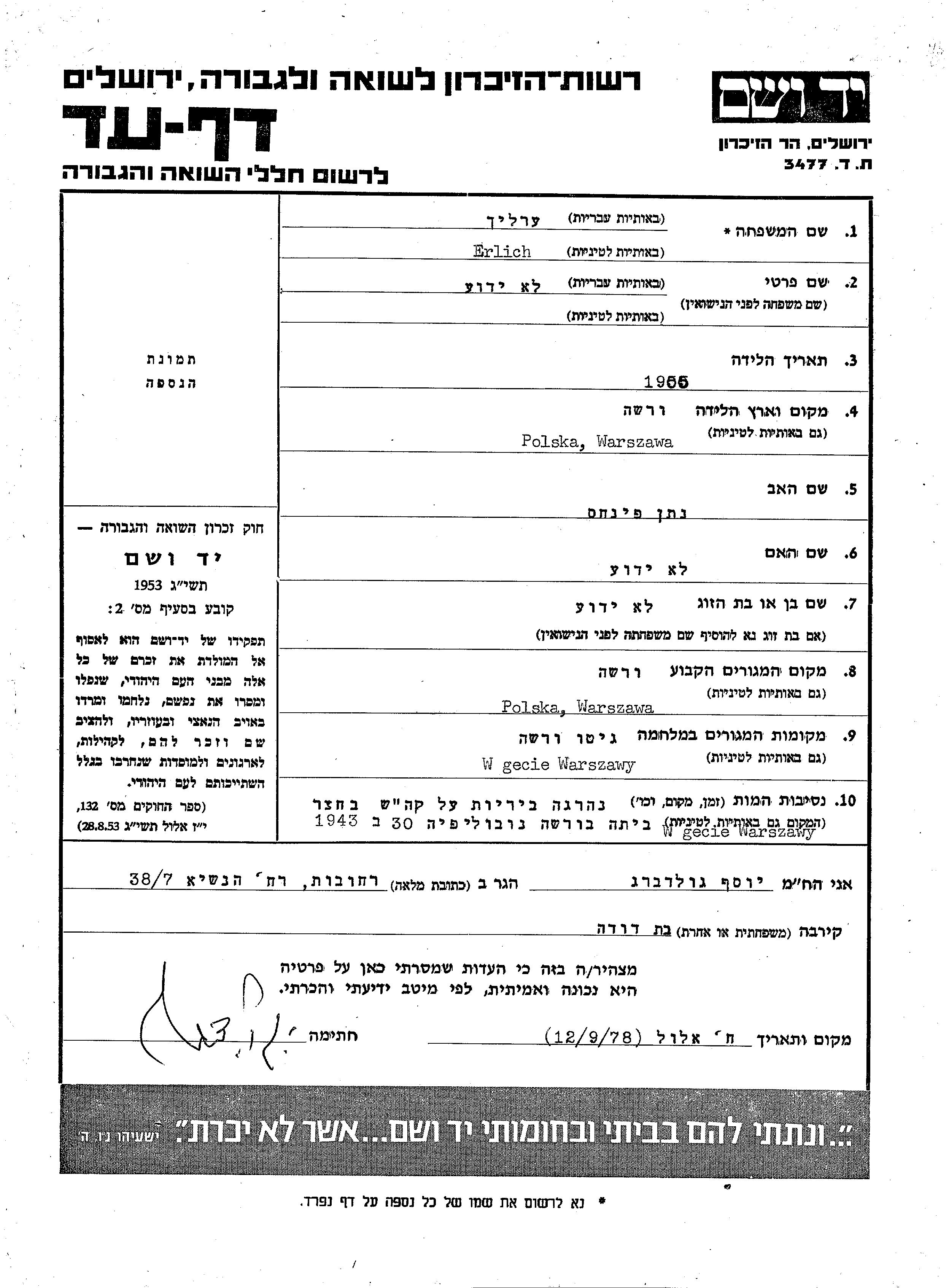 Vorname unbekannt Erlich wurde im Jahr 1900 in Warszawa, Polen geboren. Sie war die Tochter von Natan Pinkhas. Vor dem Zweiten Weltkrieg lebte sie in Warszawa, Polen. Während des Krieges war sie in Warszawa, Polen.