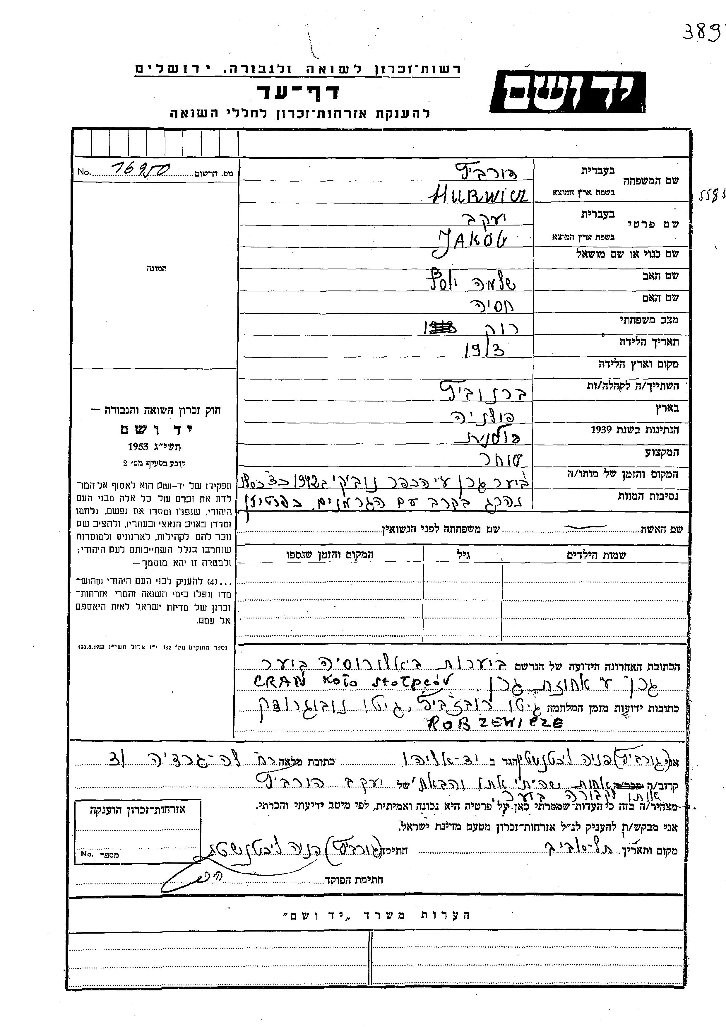 Jakob Hurwicz wurde im Jahr 1913 geboren. Er war der Sohn von Shlomo Yosef und Khasia. Er war Kaufmann/-frau. Vor dem Zweiten Weltkrieg lebte er in Baranowicz, Polen. Während des Krieges war er in Nowogrodek, Polen.