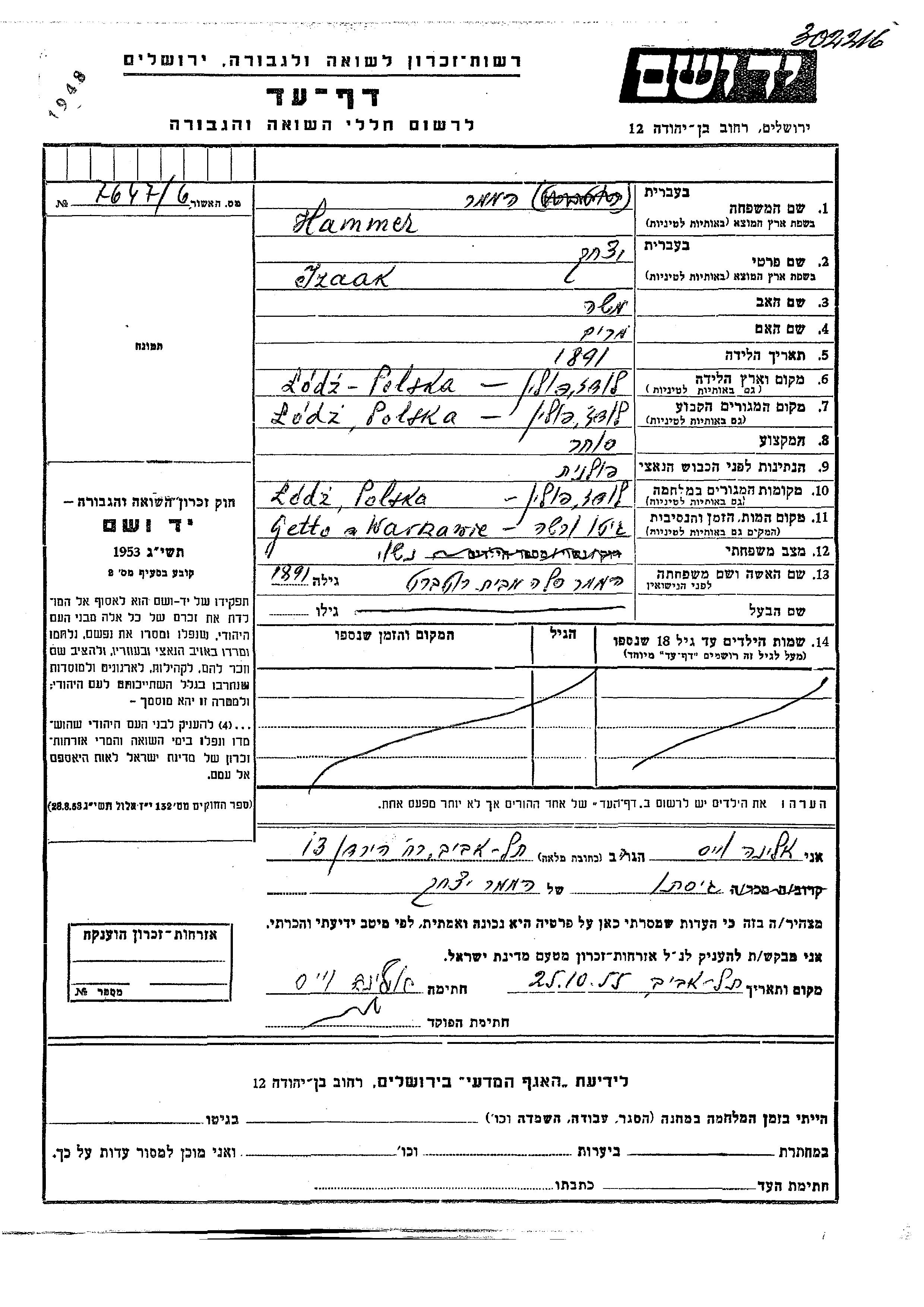 Jzaak Hammer wurde im Jahr 1891 in Lodz, Polen geboren. Er war der Sohn von Moshe und Miriam. Er war Kaufmann/-frau und mit Sala Verheiratet. Vor dem Zweiten Weltkrieg lebte er in Lodz, Polen. Während des Krieges war er in Lodz, Polen.