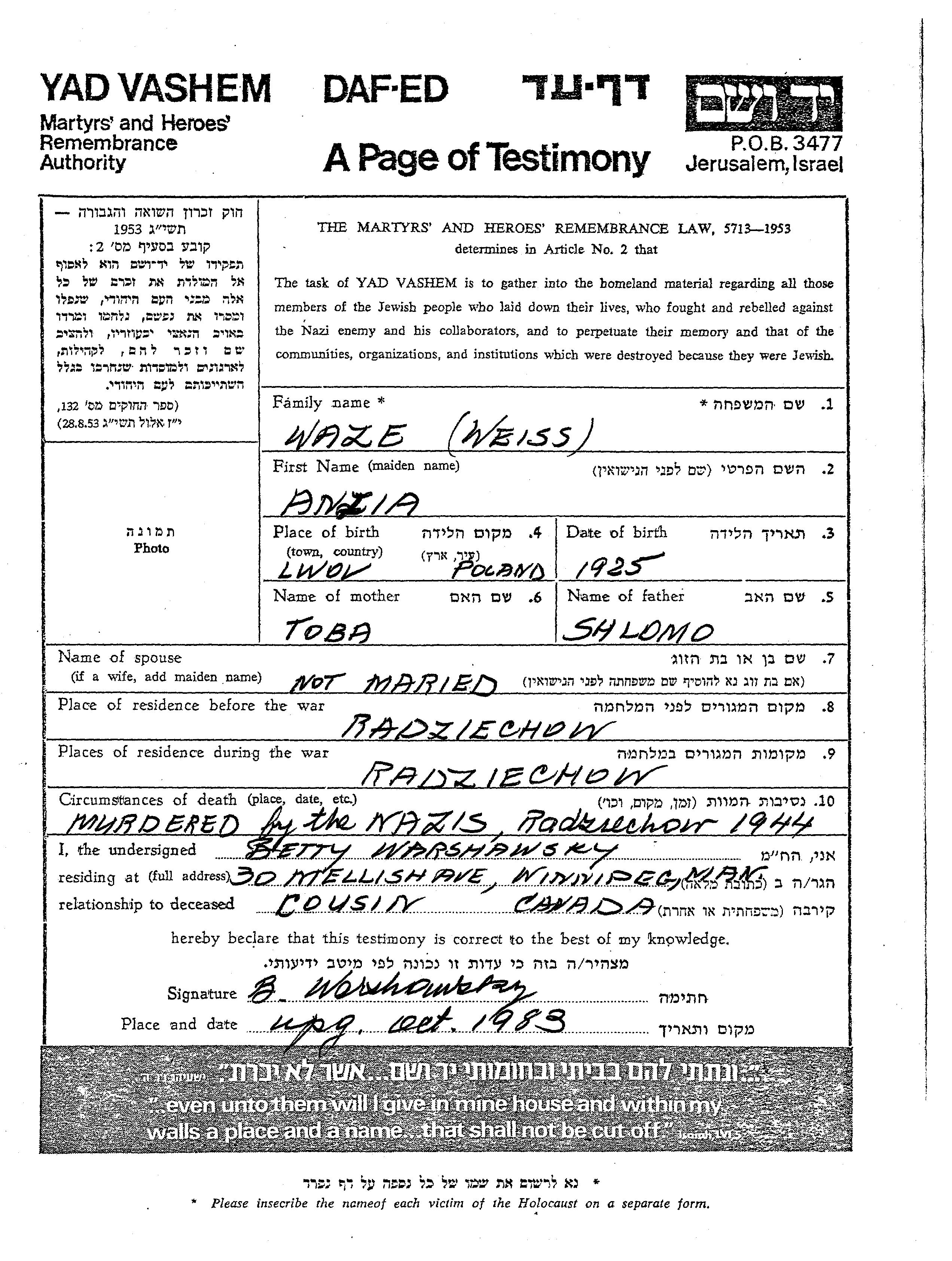 Anzia Waze Weiss wurde im Jahr 1925 in Lwow, Polen geboren. Sie war die Tochter von Shlomo und Toba. Sie war Ledig. Vor dem Zweiten Weltkrieg lebte sie in Radziechow, Polen. Während des Krieges war sie in Radziechow, Polen.