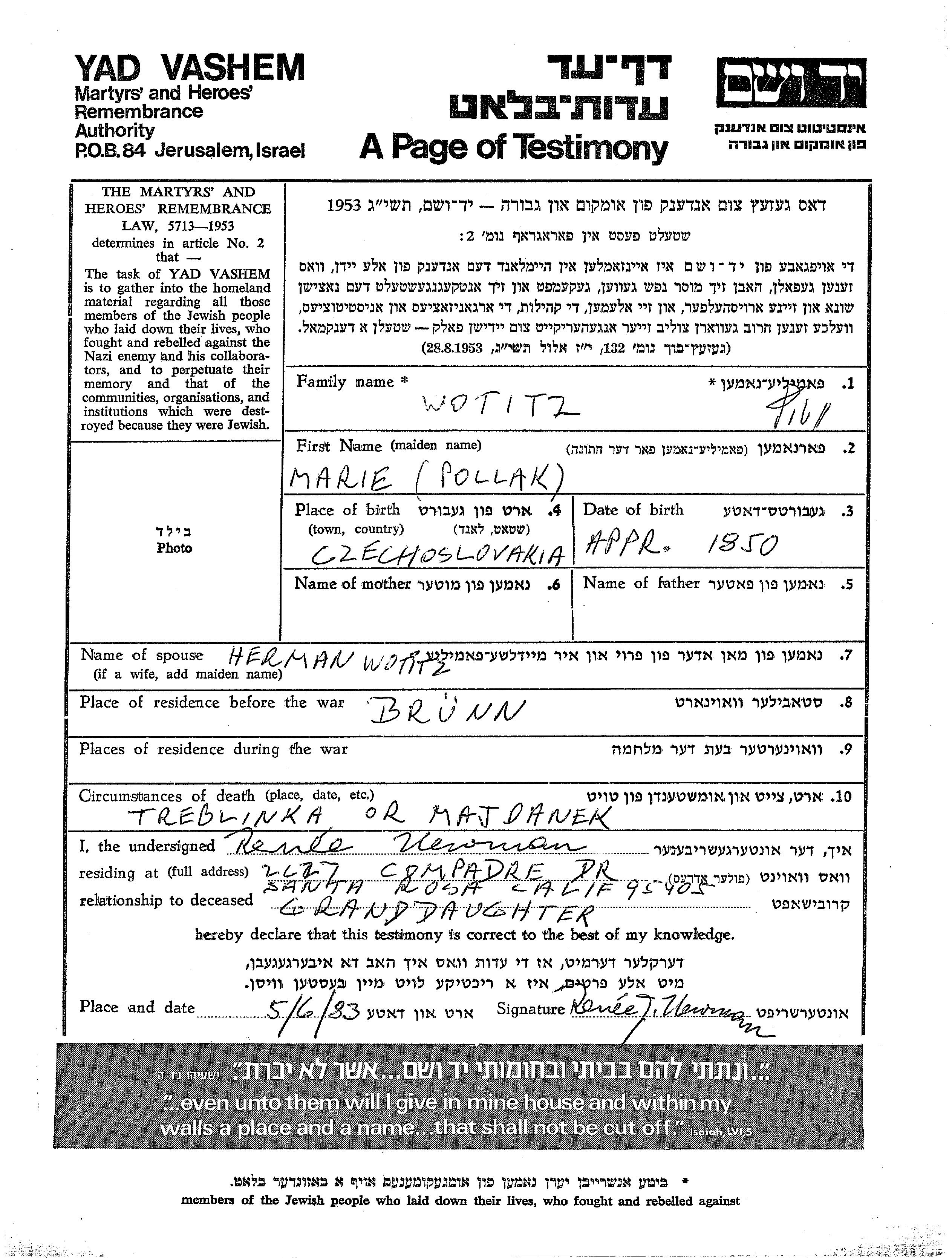 Marie Wotitz, geb. Pollak wurde im Jahr 1850 in Tschechoslowakei geboren. Sie war mit Herman Verheiratet. Vor dem Zweiten Weltkrieg lebte sie in Brunn, Tschechoslowakei.
