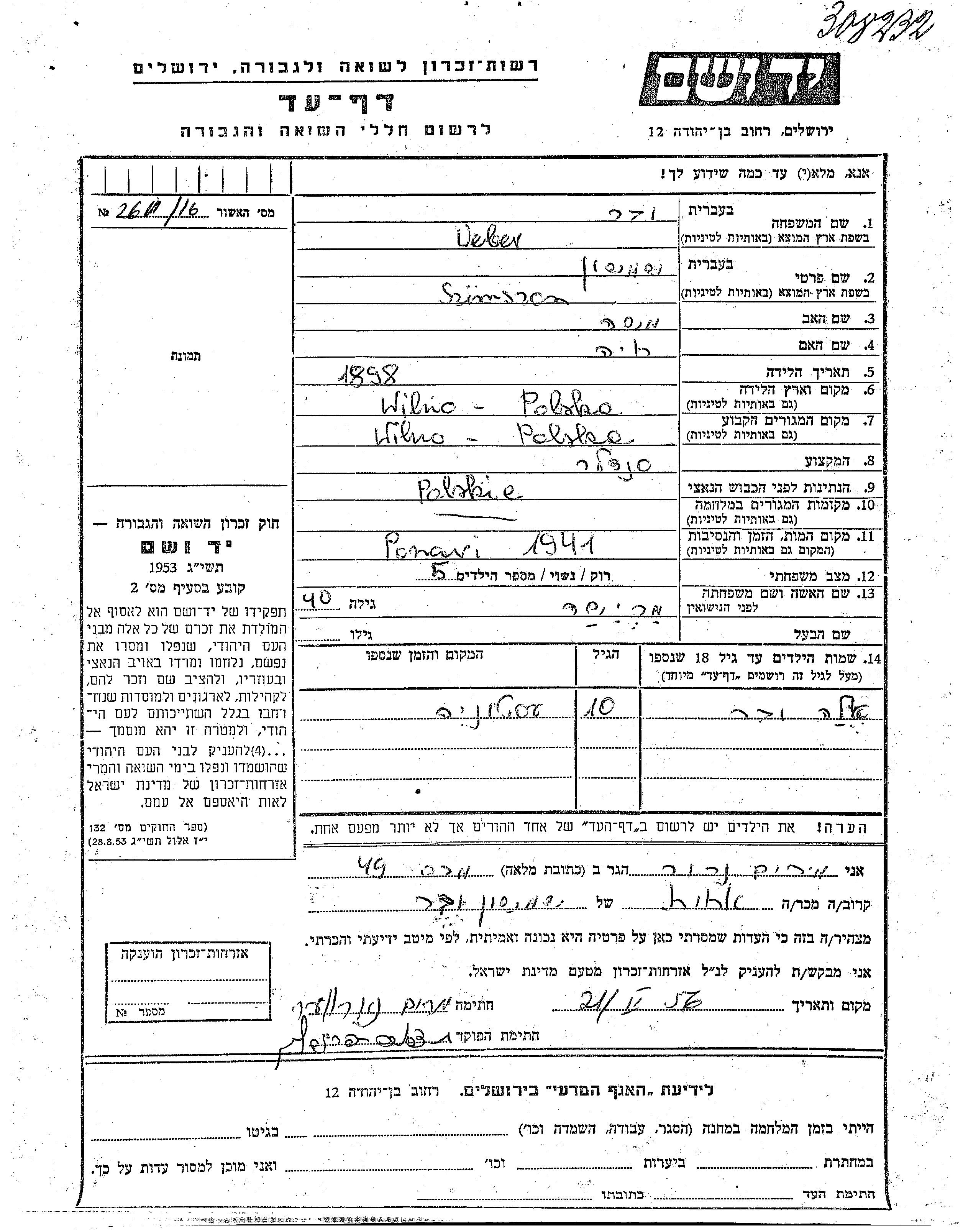 Szimszon Weber Vaver wurde im Jahr 1898 in Wilno, Polen geboren. Er war der Sohn von Moshe und Khaia. Er war Schuster/-in und mit Marisha Verheiratet. Vor dem Zweiten Weltkrieg lebte er in Wilno, Polen.