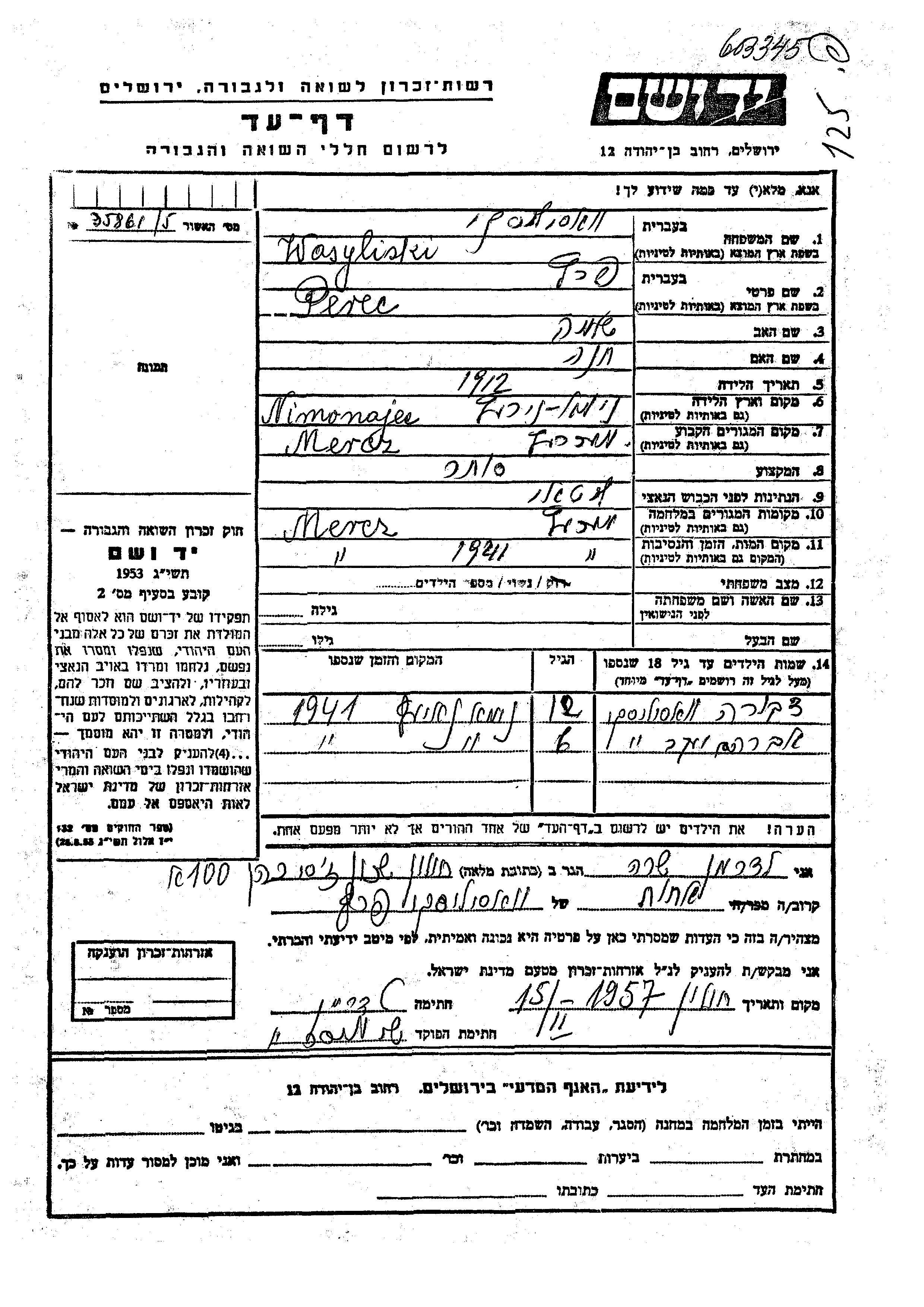 Perec wurde in der Schoah ermordet. Todesort: Merez, Litauen im Jahr 1941.