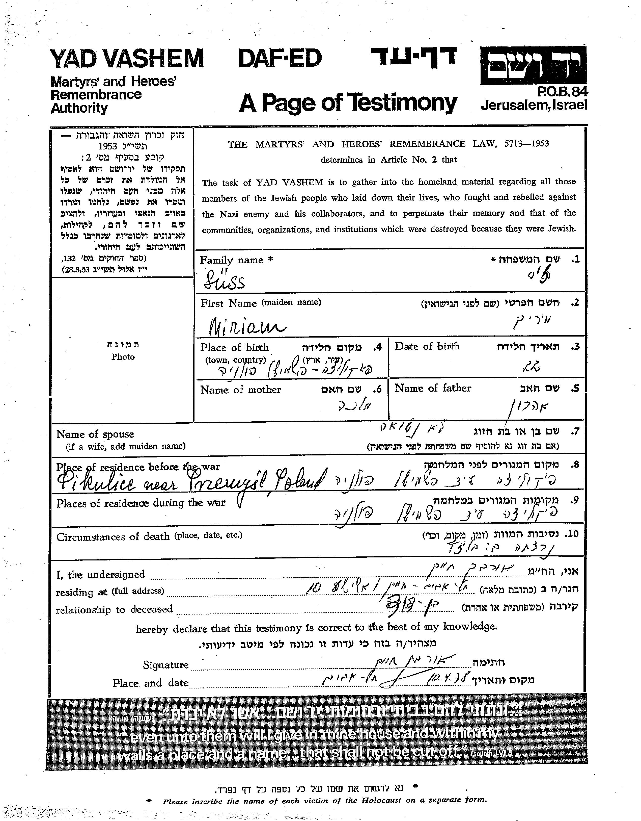 Miriam Süß wurde in Pikulice, Polen geboren. Sie war die Tochter von Aharon und Makhla. Sie war Ledig. Vor dem Zweiten Weltkrieg lebte sie in Pikulice, Polen. Während des Krieges war sie in Pikulice, Polen.