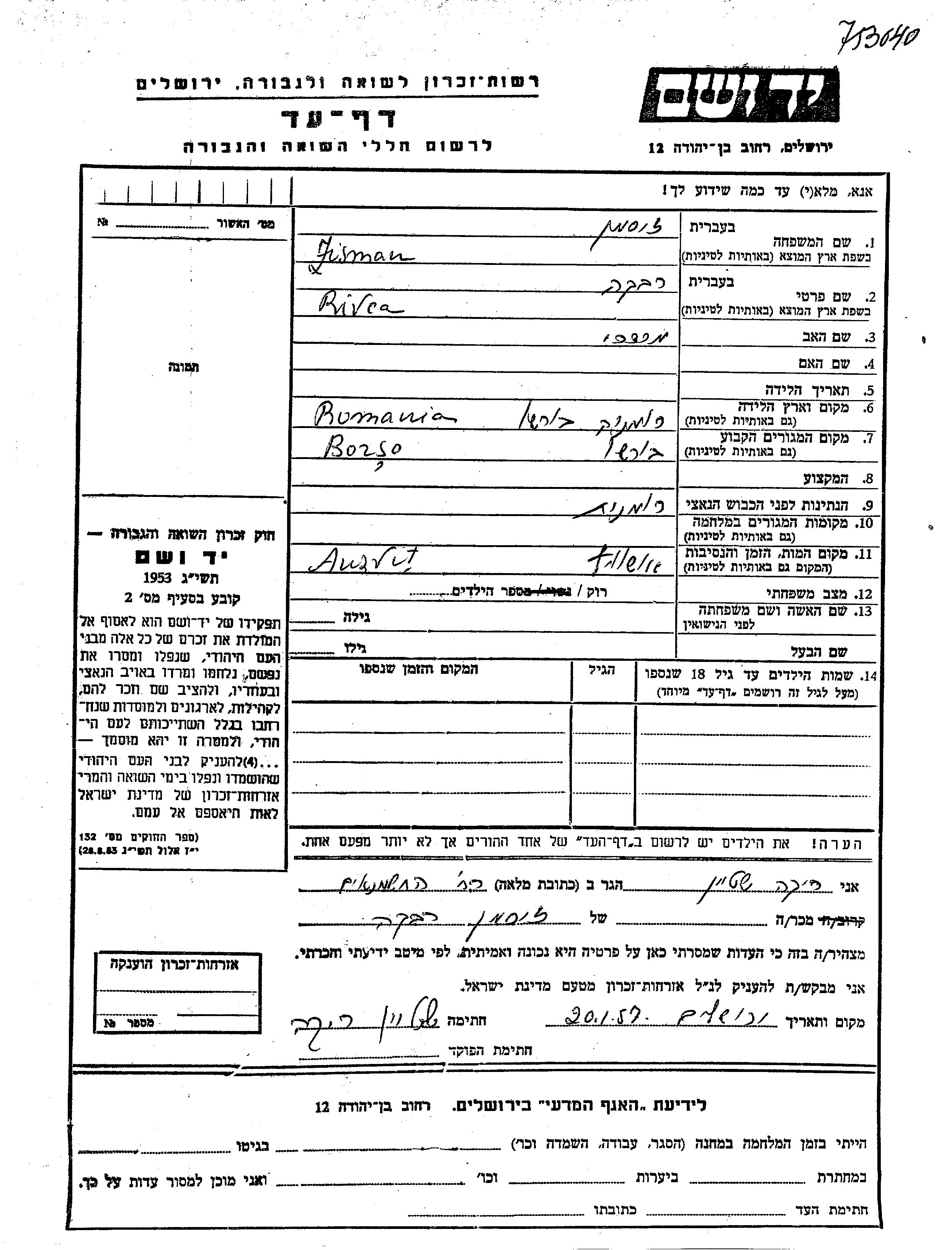 Zisman Rivca Borso, Rumänien Gedenkblatt