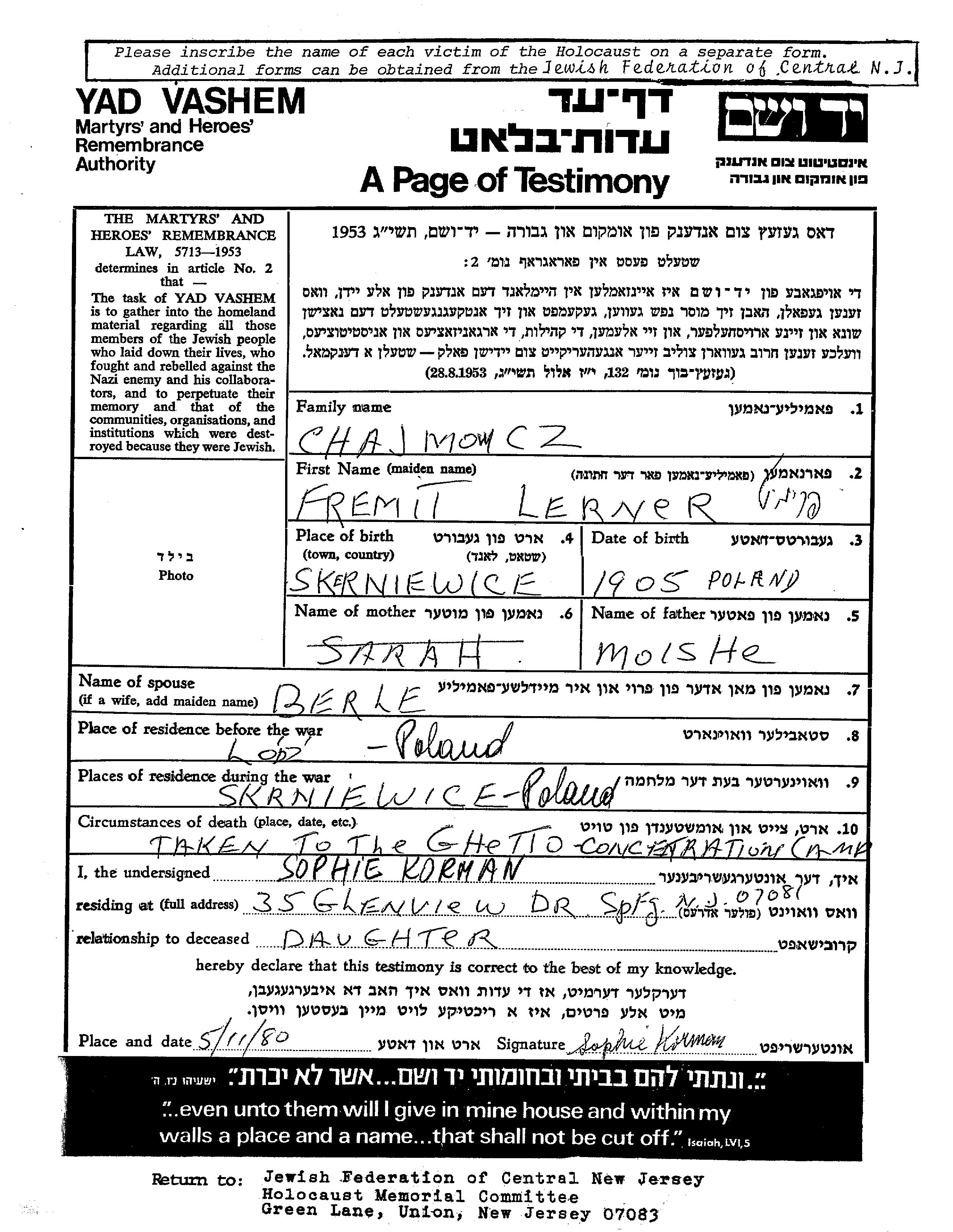 Fremit Chajmowicz, geb. Lerner wurde im Jahr 1905 in Skerniewice, Polen geboren. Sie war die Tochter von Moishe und Sarah. Sie war mit Berle Verheiratet. Vor dem Zweiten Weltkrieg lebte sie in Lodz, Polen. Während des Krieges war sie in Skerniewice, Polen.