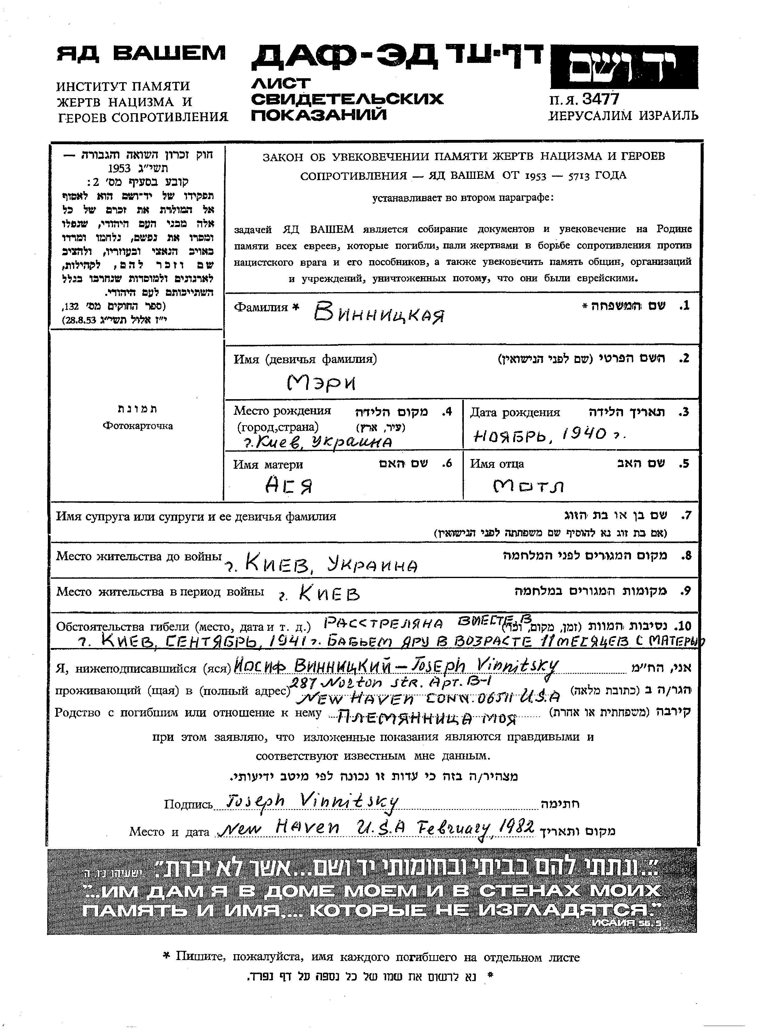 Mari Vinnitzki wurde im Jahr 1940 in Kiev, Ukraine (UdSSR) geboren. Sie war die Tochter von Motl und Asya. Sie war Kind. Vor dem Zweiten Weltkrieg lebte sie in Kiev, Ukraine (UdSSR). Während des Krieges war sie in Kiev, Ukraine (UdSSR).
