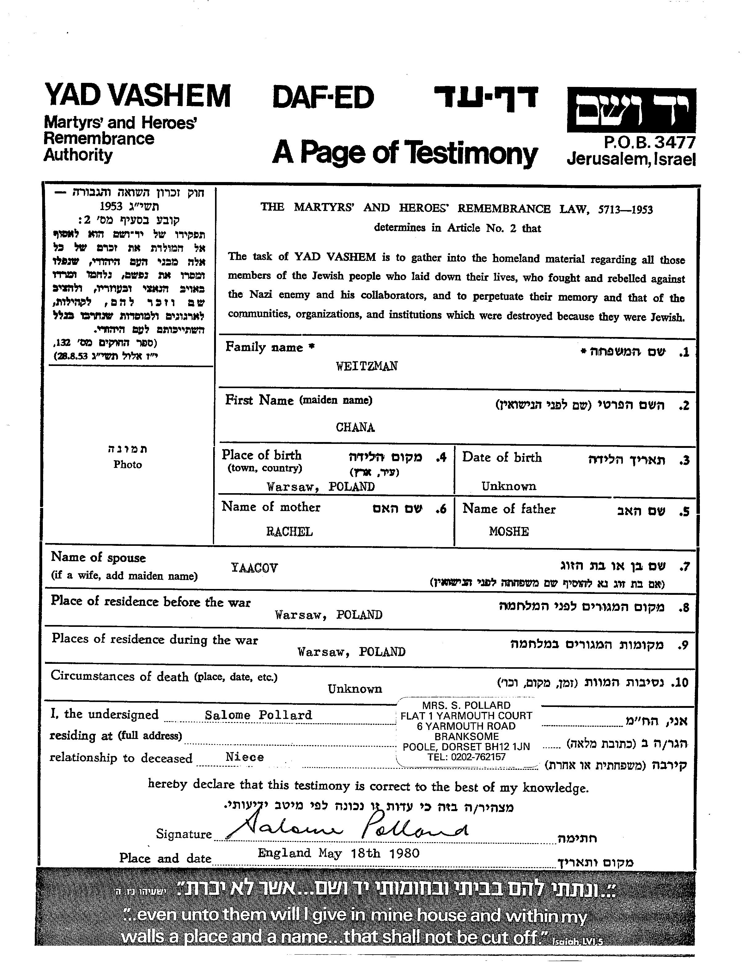 Chana Weitzman wurde in Warsaw, Polen geboren. Sie war die Tochter von Moshe und Rachel. Sie war mit Yaacov Verheiratet. Vor dem Zweiten Weltkrieg lebte sie in Warsaw, Polen. Während des Krieges war sie in Warsaw, Polen.