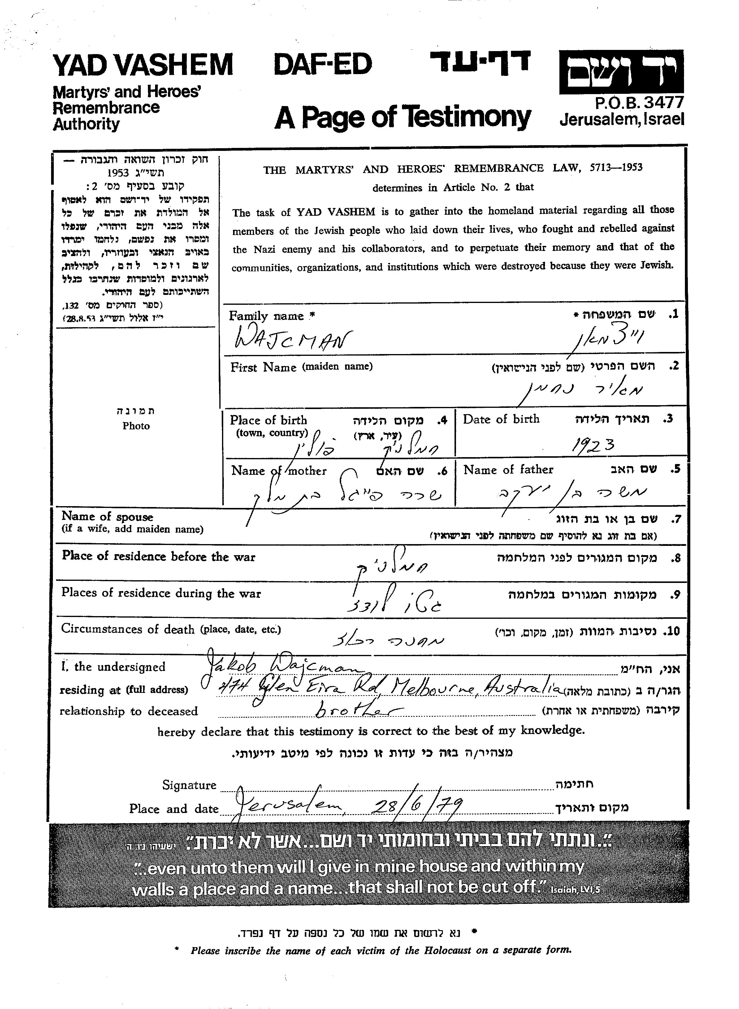 Wajcman Meir Nakhman 1923 Chelmnik, Polen Gedenkblatt