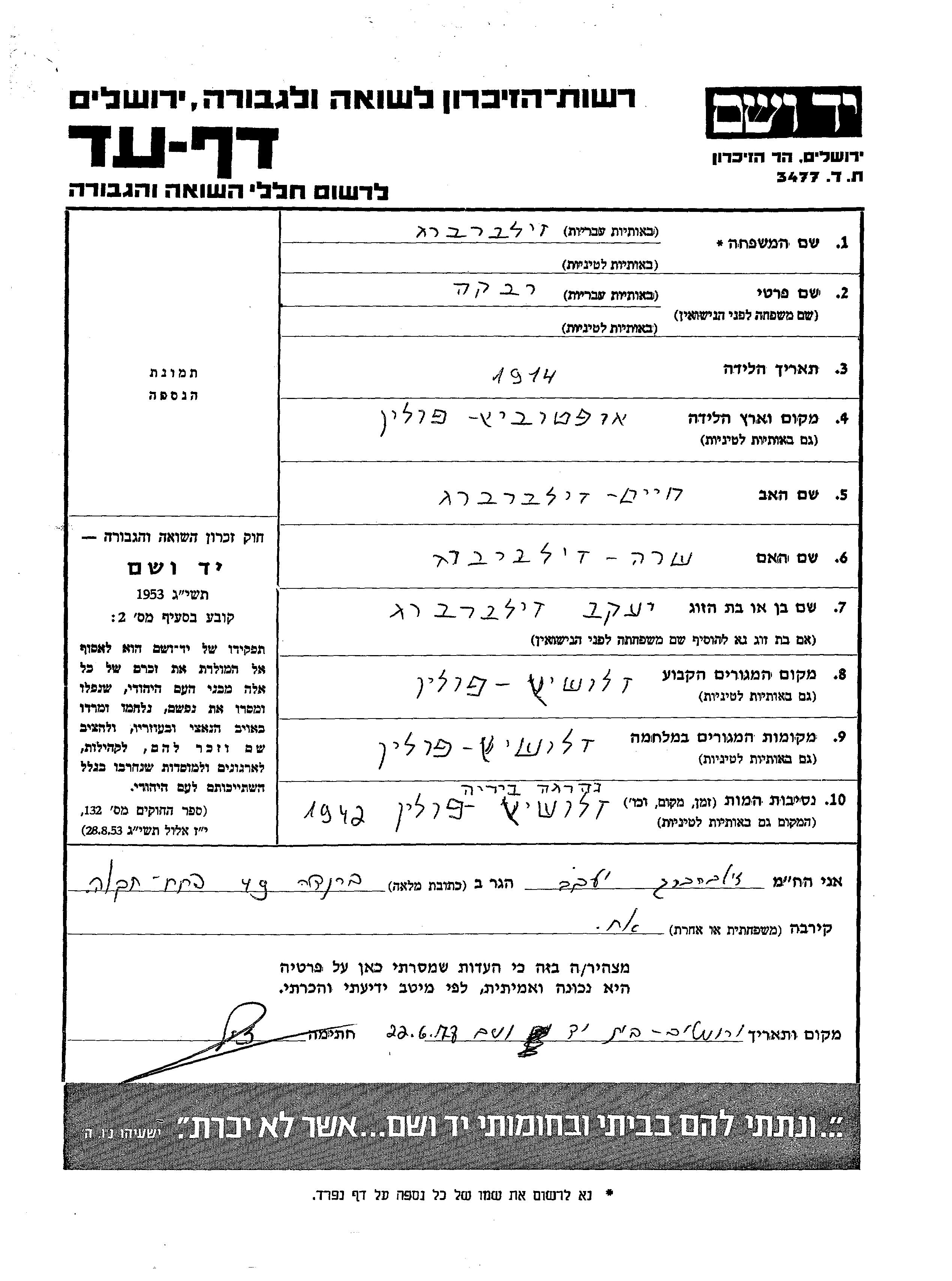 Zilberberg Rivka 1914 Zaloshits, Polen Gedenkblatt