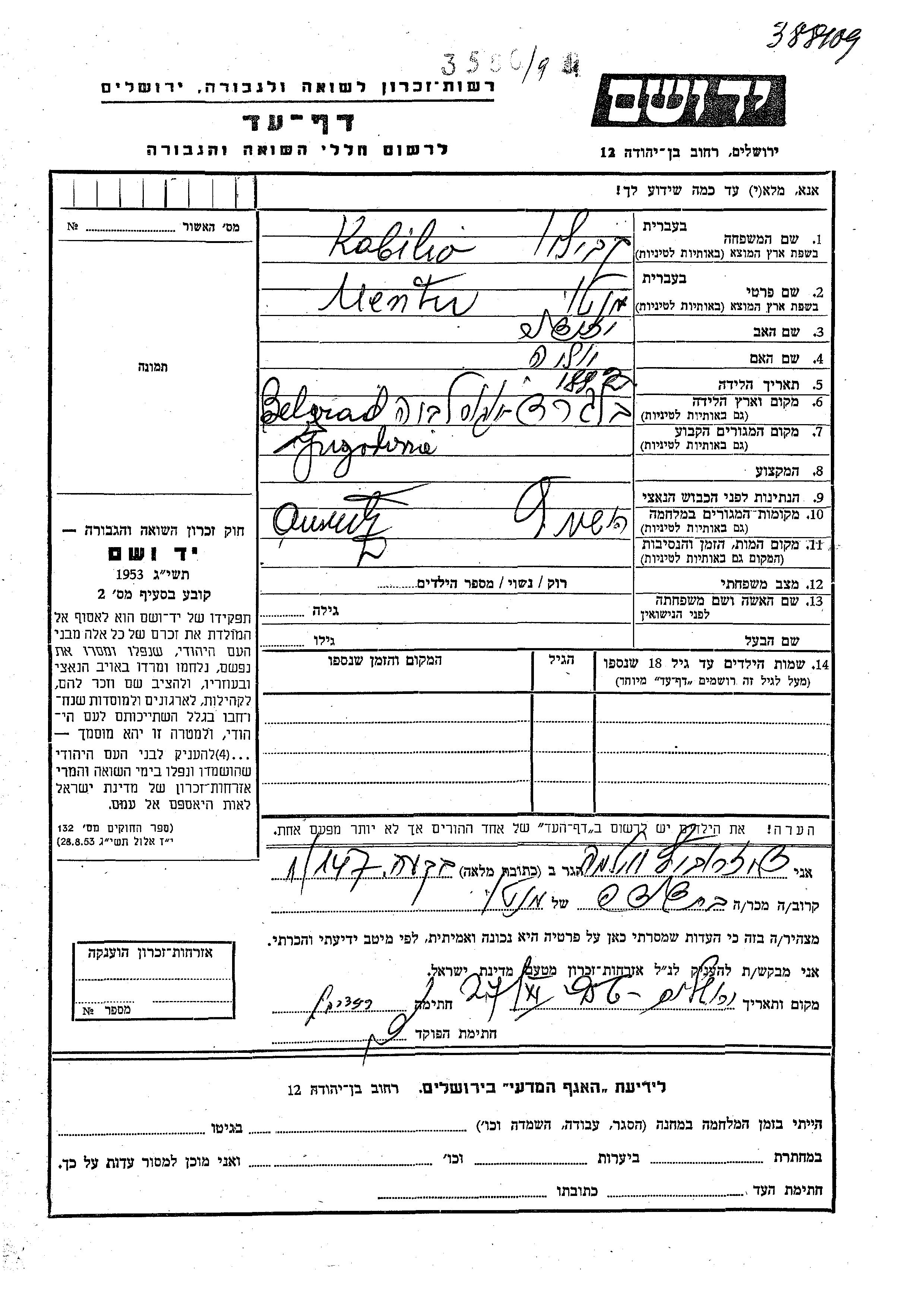 Mentu wurde in der Schoah ermordet. Todesort: Auschwitz, Polen.