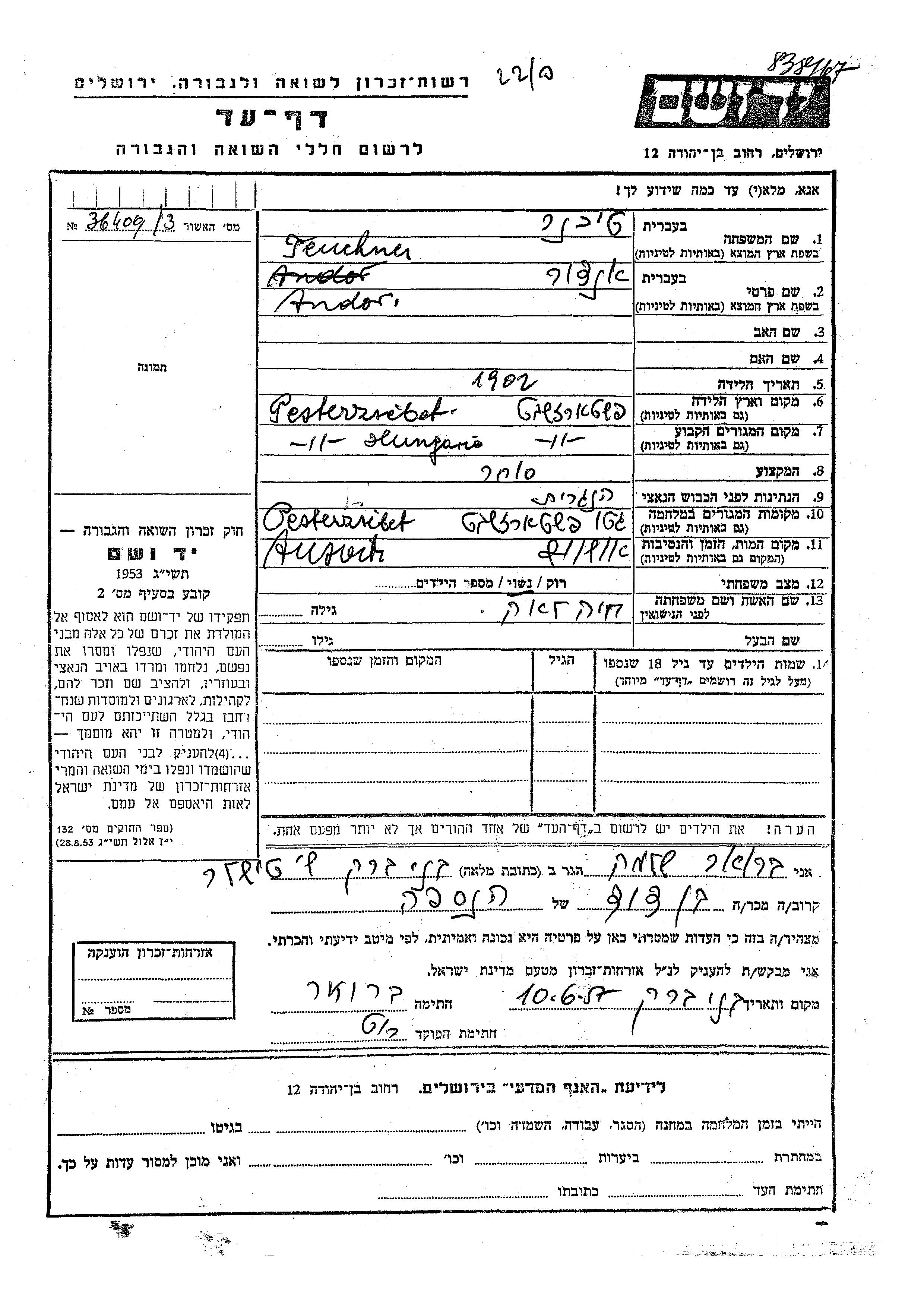 Andor Teuchner Teikhner wurde im Jahr 1902 in Pesterzsebet, Ungarn geboren. Er war Kaufmann/-frau und mit Khaia Lea Verheiratet. Vor dem Zweiten Weltkrieg lebte er in Pesterzsebet, Ungarn. Während des Krieges war er in Pesterzsebet, Ungarn.